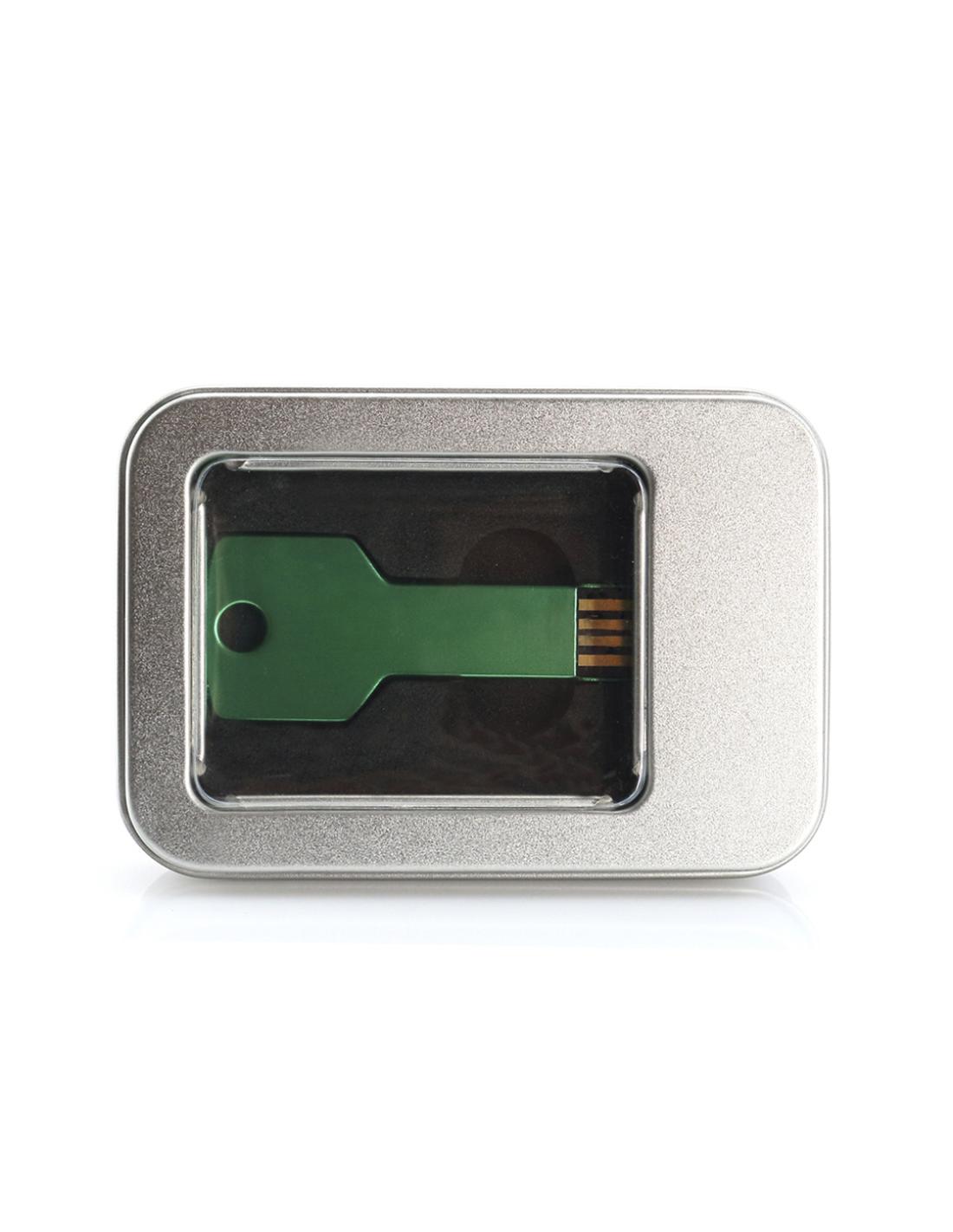 Memoria USB en forma de llave de 16GB de capacidad, de acabado en aluminio brillante y diseñada para llevar en el llavero. Presentada en estuche individual metálico con ventana y suave espuma troquelada.