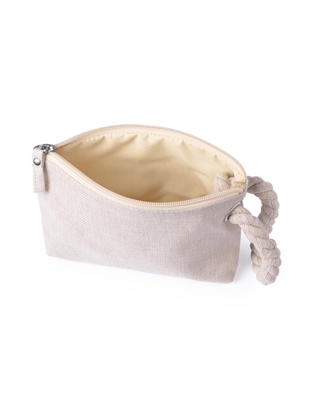 Portatodo multiusos en suave combinación de algodón y poliéster en tonos crudos naturales. Cremallera a juego, con práctica asa trenzada, argolla de refuerzo metálica y suave forro interior en color crudo.