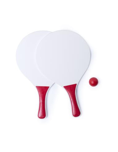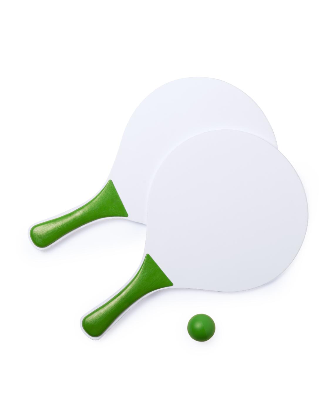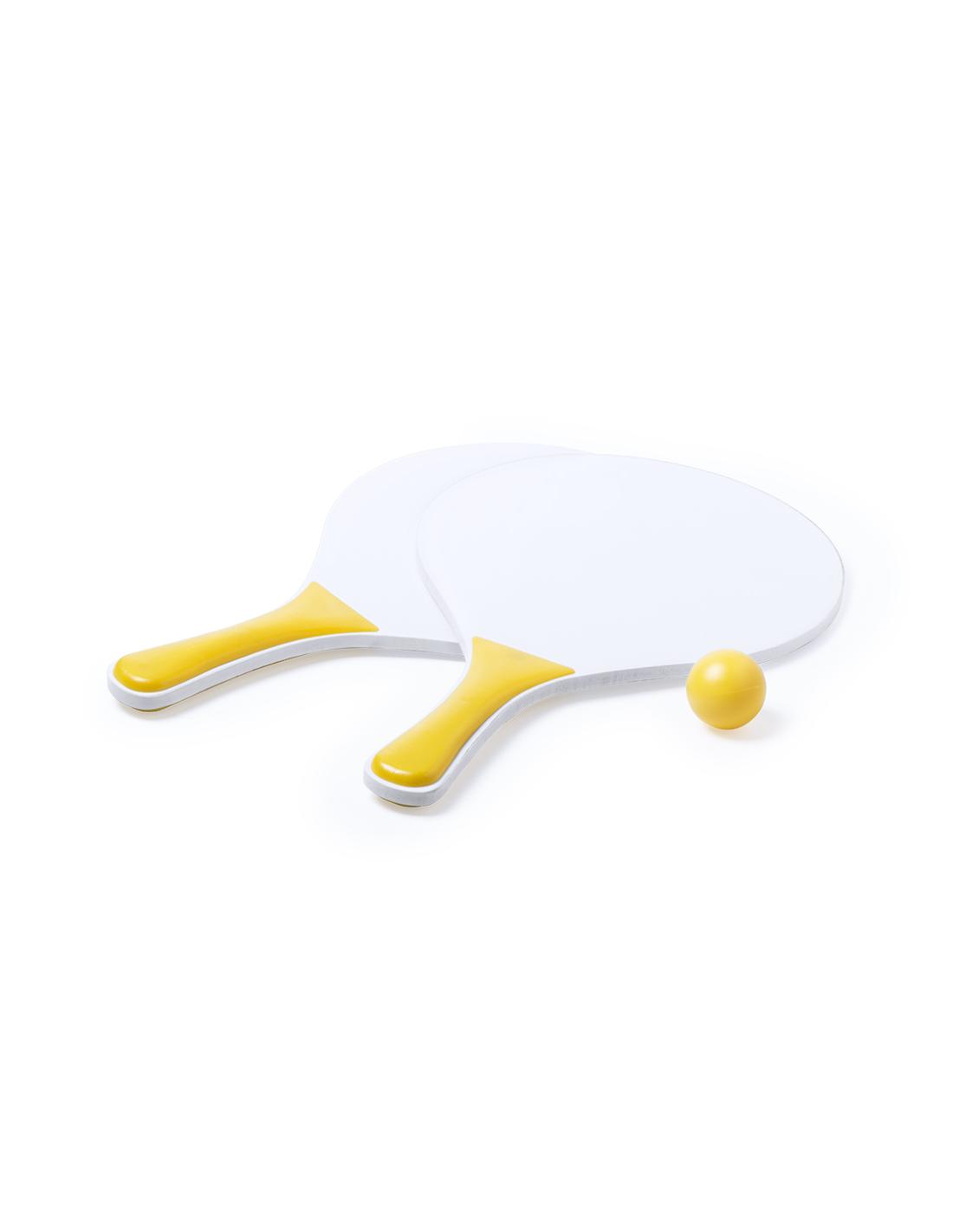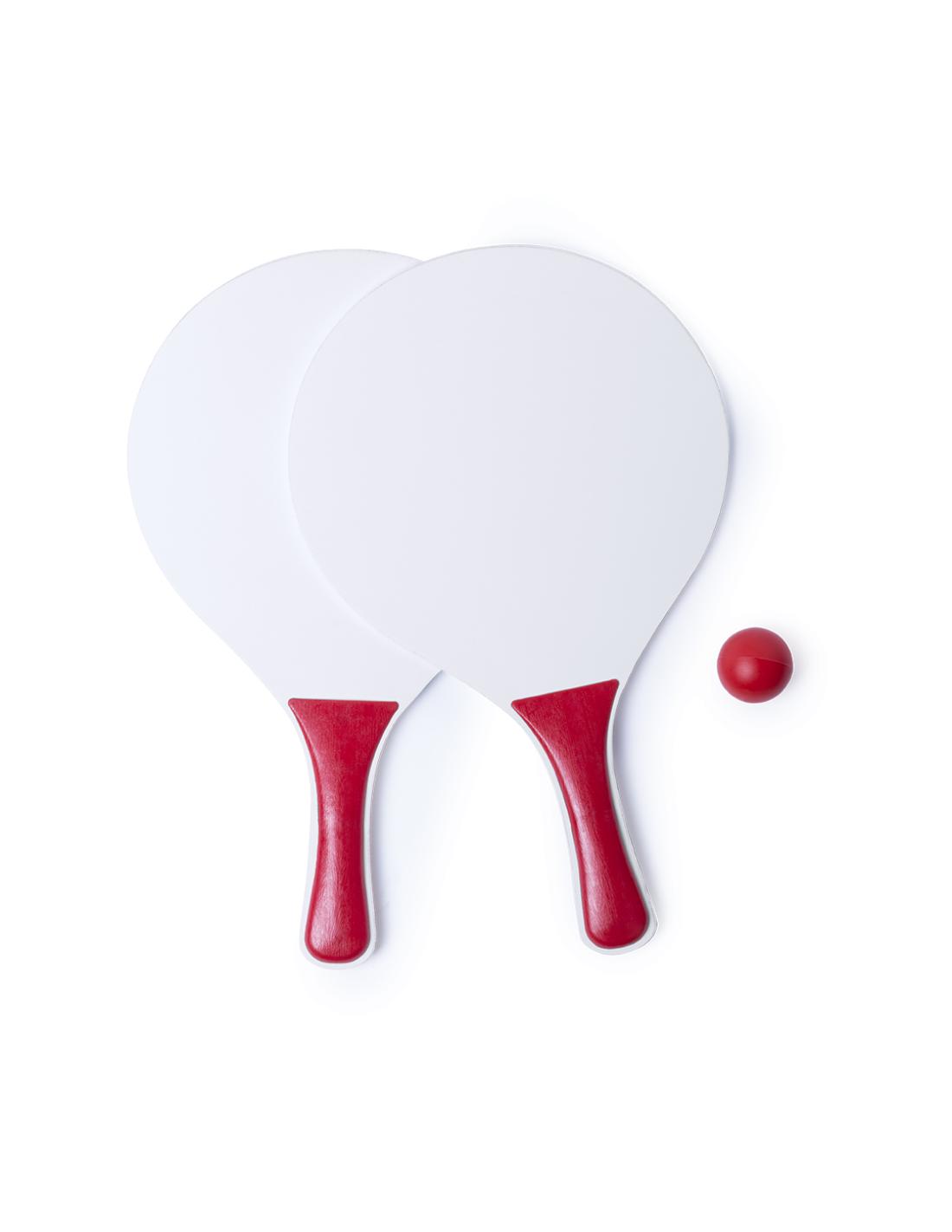 Par de palas de playa en madera natural blanca. Con mango reforzado en variada gama de vivos colores. Presentadas en bolsa redecilla con pelota a juego.