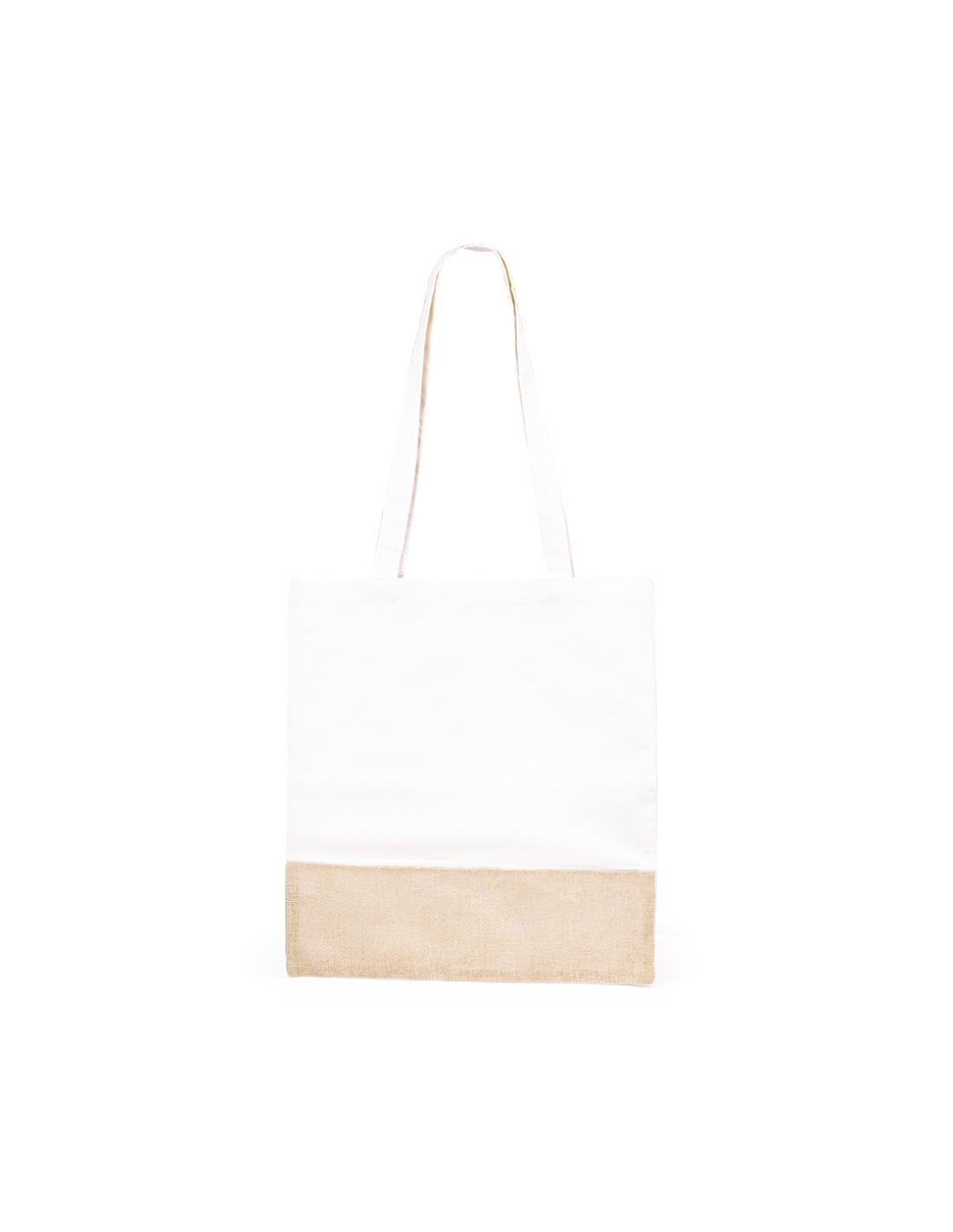 Bolsa ecológica en resistente combinación de materiales naturales -yute y algodón- de 245g/m2. Con atractivo diseño bicolor y acabado cosido. Asas largas de 70 cm reforzadas y resistencia hasta 8kg de peso.