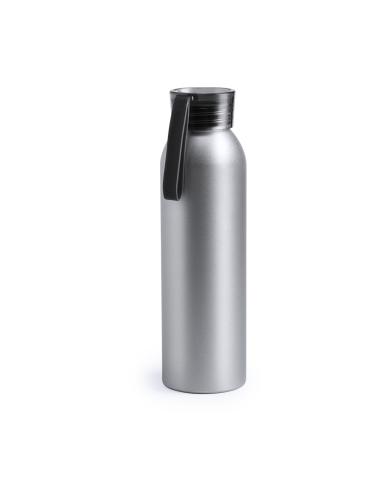 Bidón de aluminio de 650 ml de capacidad. Cuerpo en color plateado, con tapón de seguridad a rosca en variada gama de colores transparentes. Cinta de transporte en material TPR a juego.