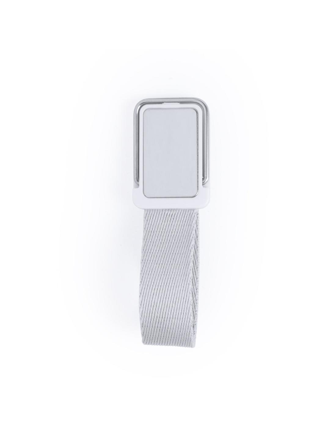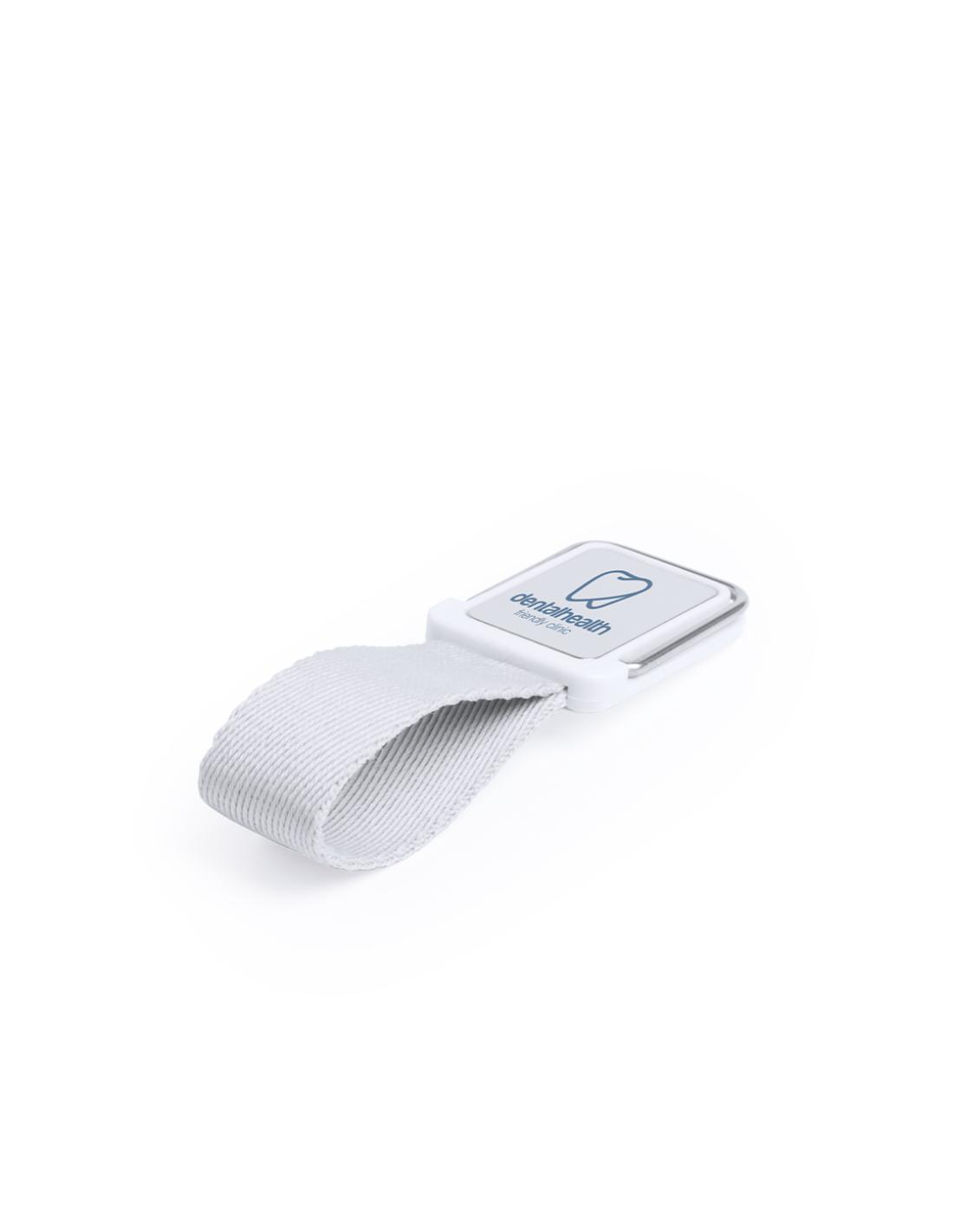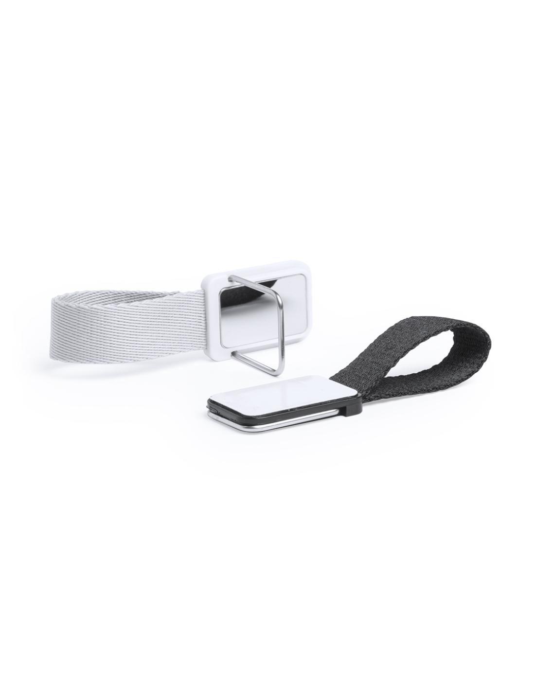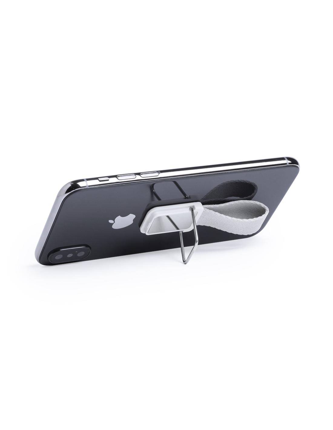 Original soporte adhesivo para smartphone con cinta para selfies en resistente poliéster y pastilla central para marcaje. Con soporte metálico y presentado en atractiva bolsita de diseño.