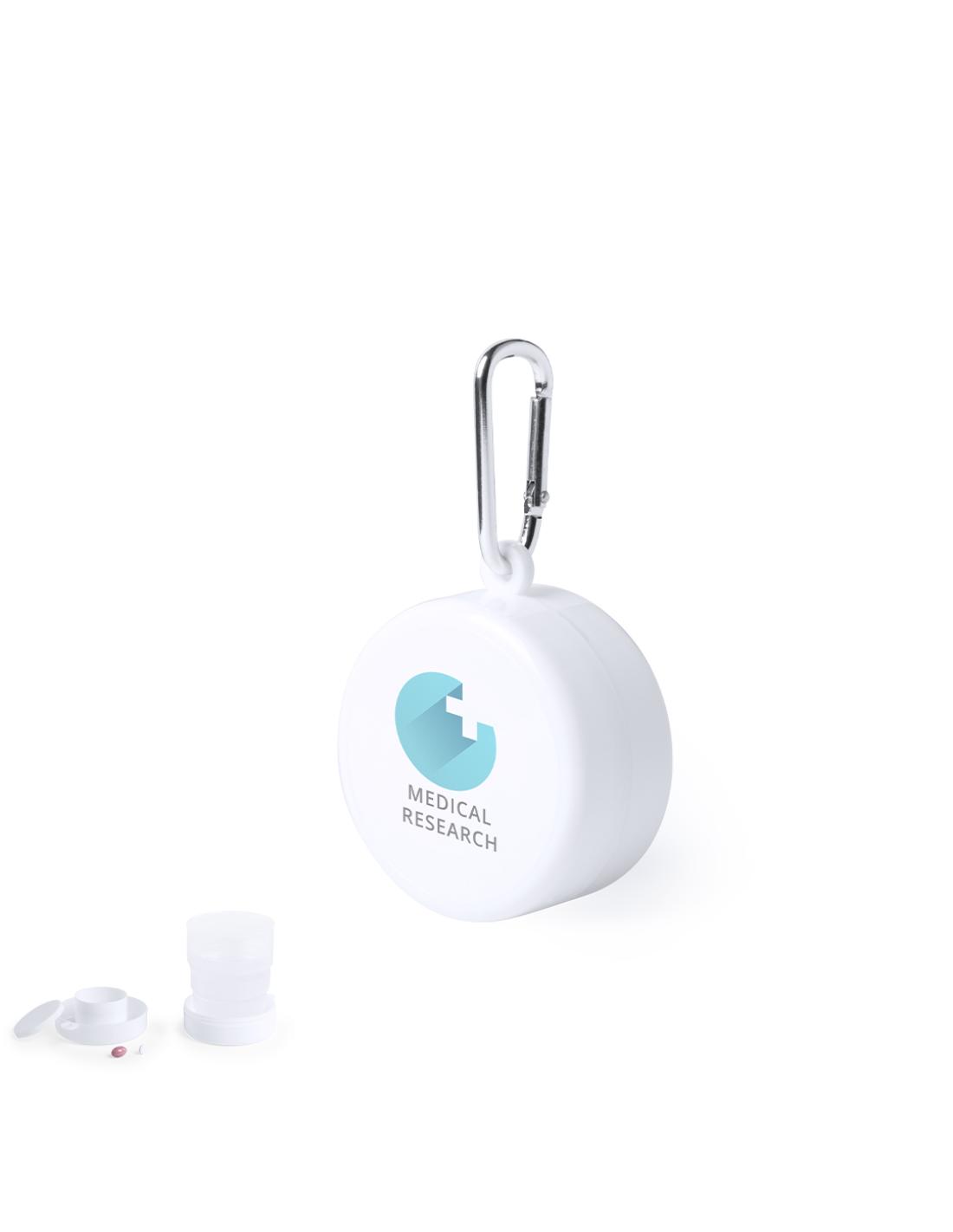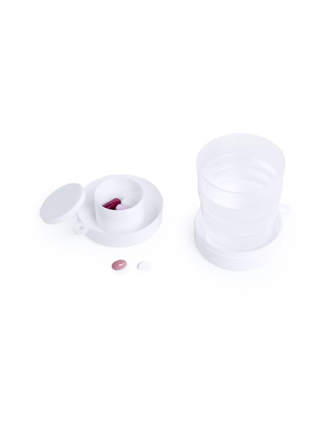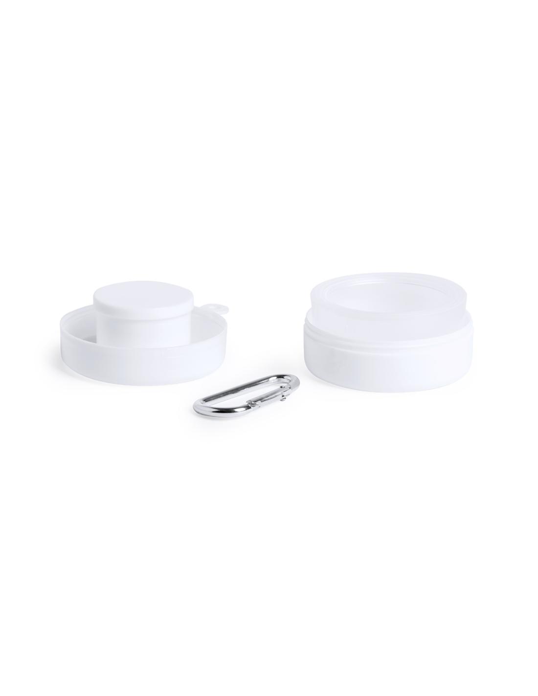 Original vaso plegable para emergencias en elegante color blanco. De 220ml de capacidad y pastillero con tapa integrado en el tapón. Con mosquetón metálico de transporte.