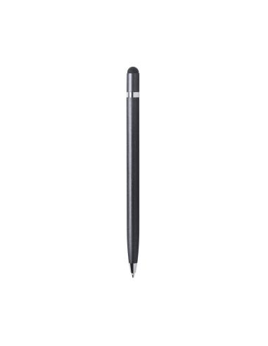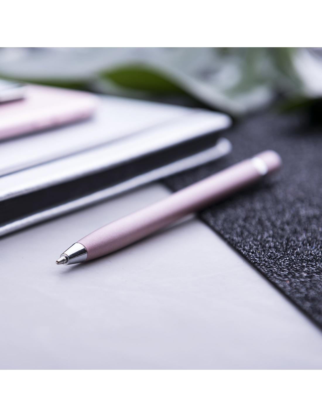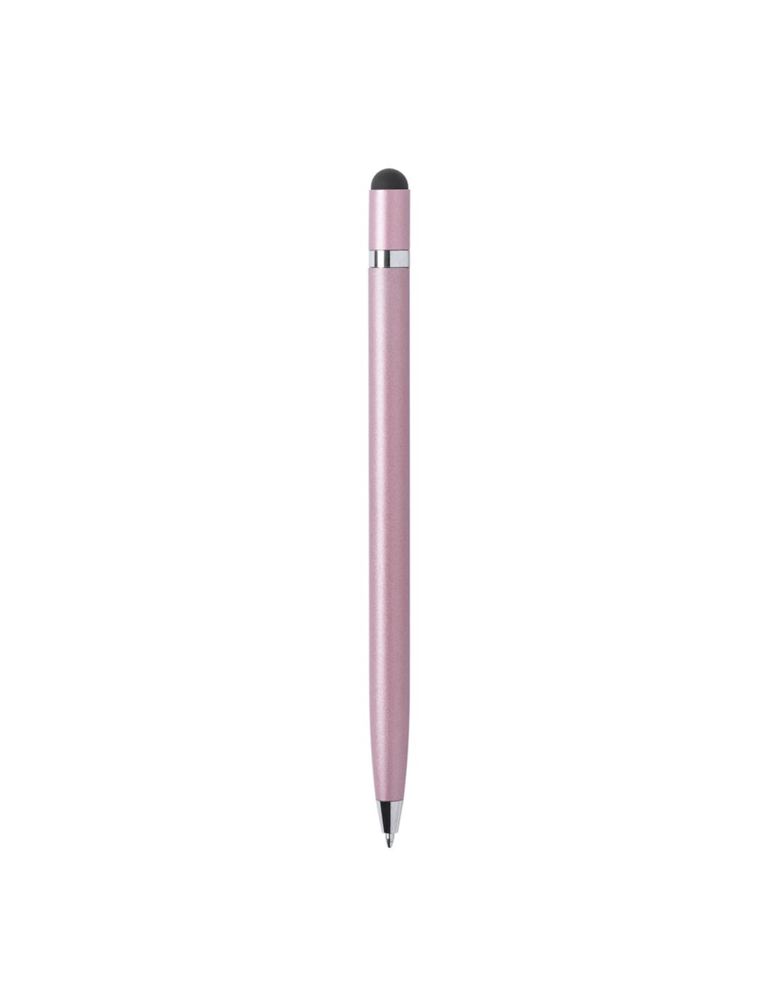 Bolígrafo puntero de mecanismo giratorio con cuerpo en aluminio de suave acabado metalizado. Con anilla cromada. Colores dorado, rosa, plateado y grafito con acabado brillo y color blanco con acabado mate. Tinta azul.