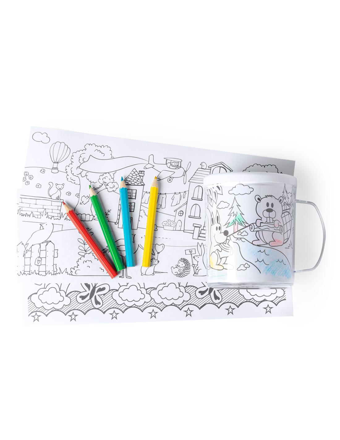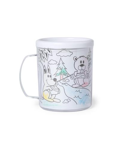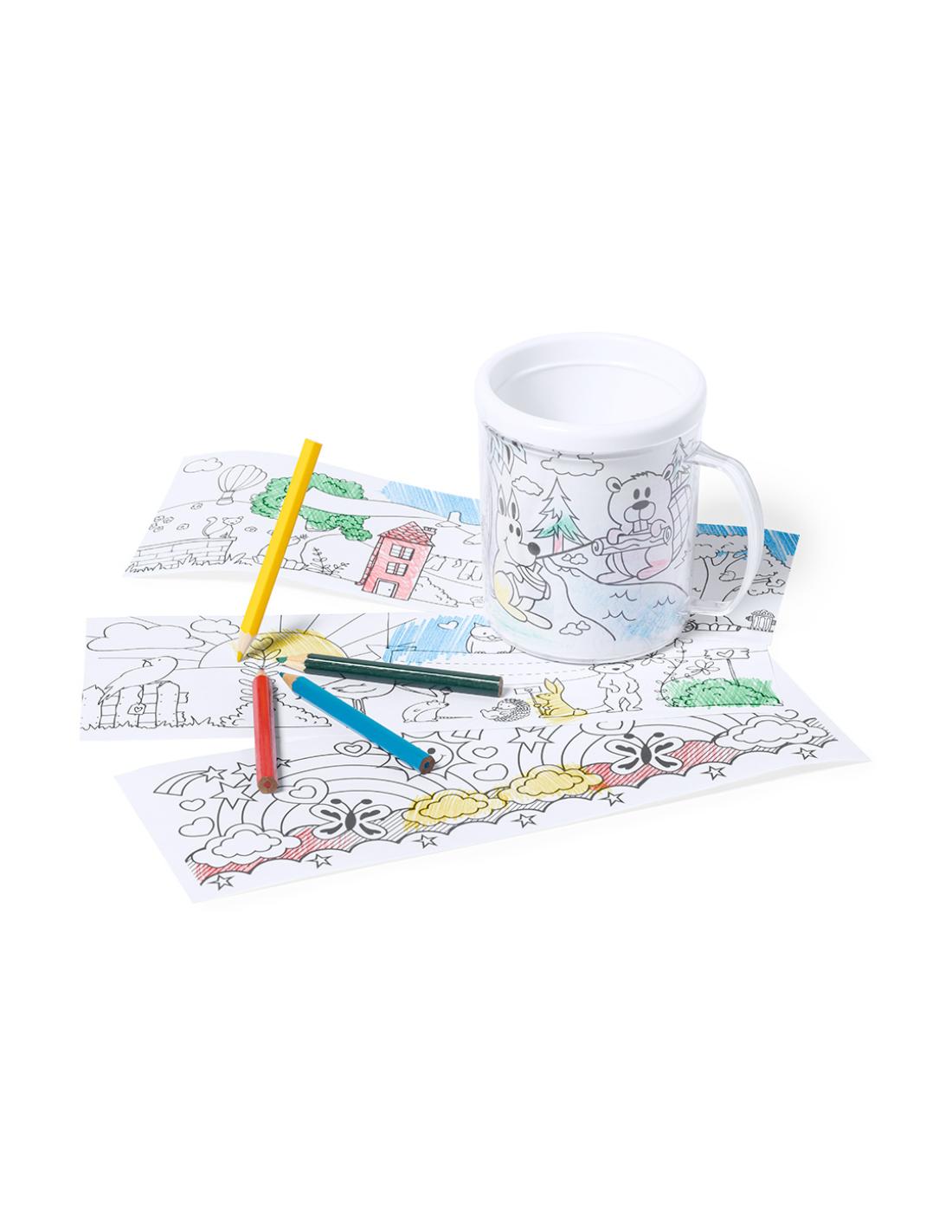 Taza para colorear de 320ml de capacidad. Carcasa exterior de la taza con cubierta transparente extraíble para insertar la lámina coloreada y parte interior en PP de color blanco. Con 4 láminas para pintar y 4 lápices de colores. Presentado en caja individual.