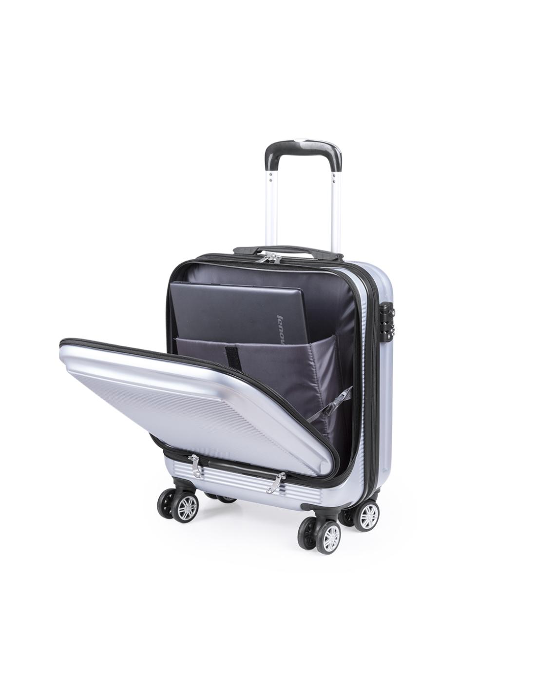 Trolley de negocios rígido en resistente material en acabado plateado. De apertura total, con 4 ruedas giratorias y cierre de seguridad por contraseña. Cierre conforme a los estándares TSA -Administración de la Seguridad en el Transporte-, que permite a las autoridades de aduanas inspeccionar el contenido del equipaje sin tener que forzar o romper el cierre, a traves de una llave especial a disposición de la autoridad. Compartimento principal con cierre de cremallera de doble tirador y doble asa de mano. Interior forrado, con bolsillo acolchado para ordenador portátil de hasta 17 pulgadas.