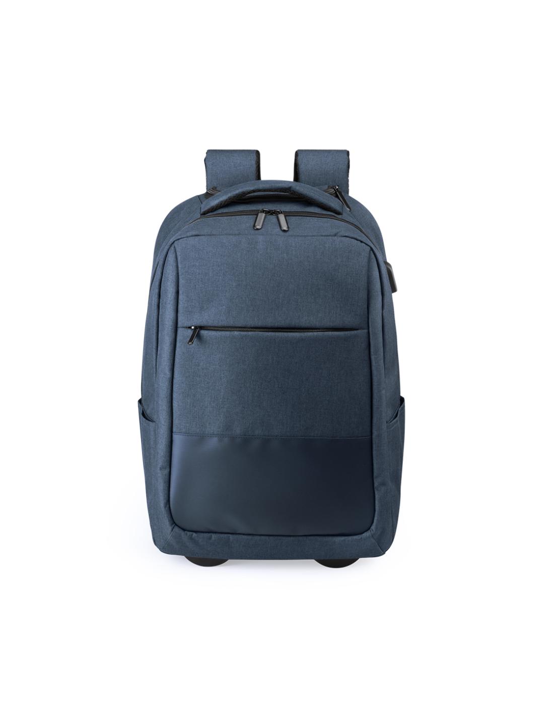 Mochila trolley en resistente poliéster 300D. Con conexión USB -powerbank no incuido- y bolsillo interior acolchado para ordenador portátil de hasta 15 pulgadas y compartimento para tablet de hasta 10 pulgadas. Bolsillo principal con doble tirador, bolsillos lateral y frontal. Compartimento para mecanismo de trolley con cierre de cremallera, asa reforzada y accesorio cubre ruedas con fijación de velcro. Espalda acolchada y cintas de hombros ajustables con acolchado.