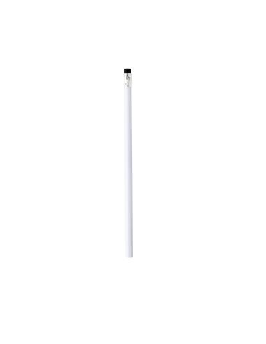 Lápiz de madera en color blanco y de acabado brillo. Con cuerpo redondo y goma de borrar disponible en variada gama de colores. Mina negra y punta sin afilar.