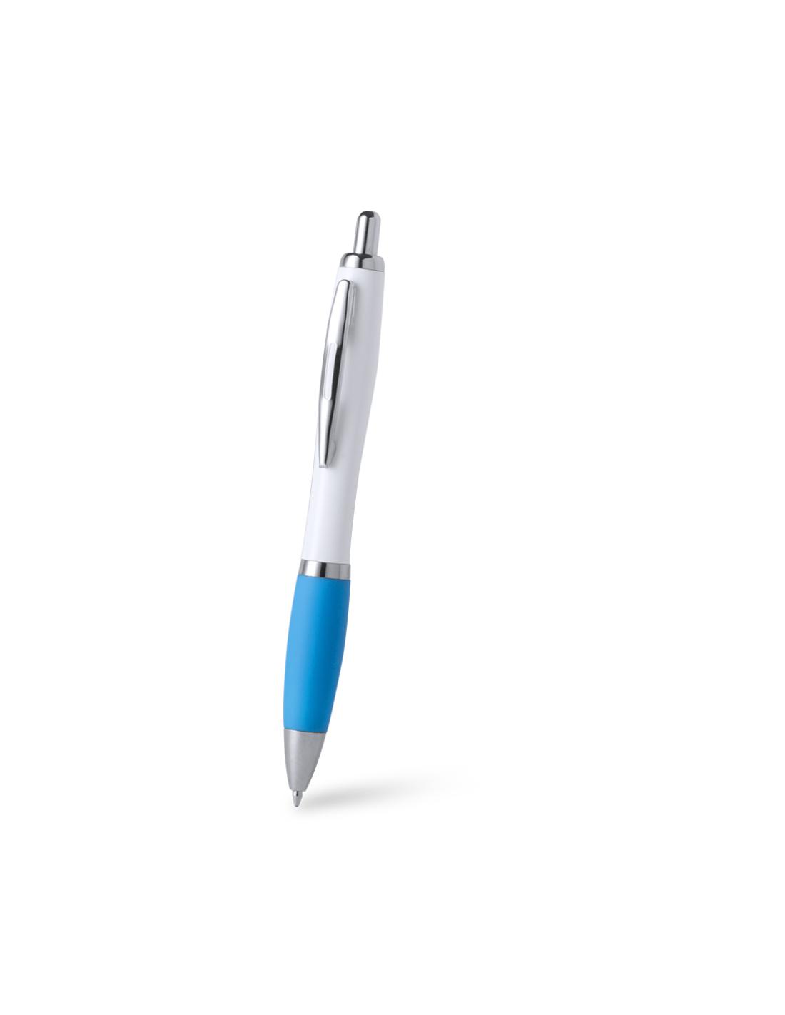 Bolígrafo de colorido diseño bicolor, con cuerpo acabado en color blanco y empuñadura en variada gama de llamativos colores. De mecanismo pulsador, con detalles cromados, clip metálico y tinta azul.