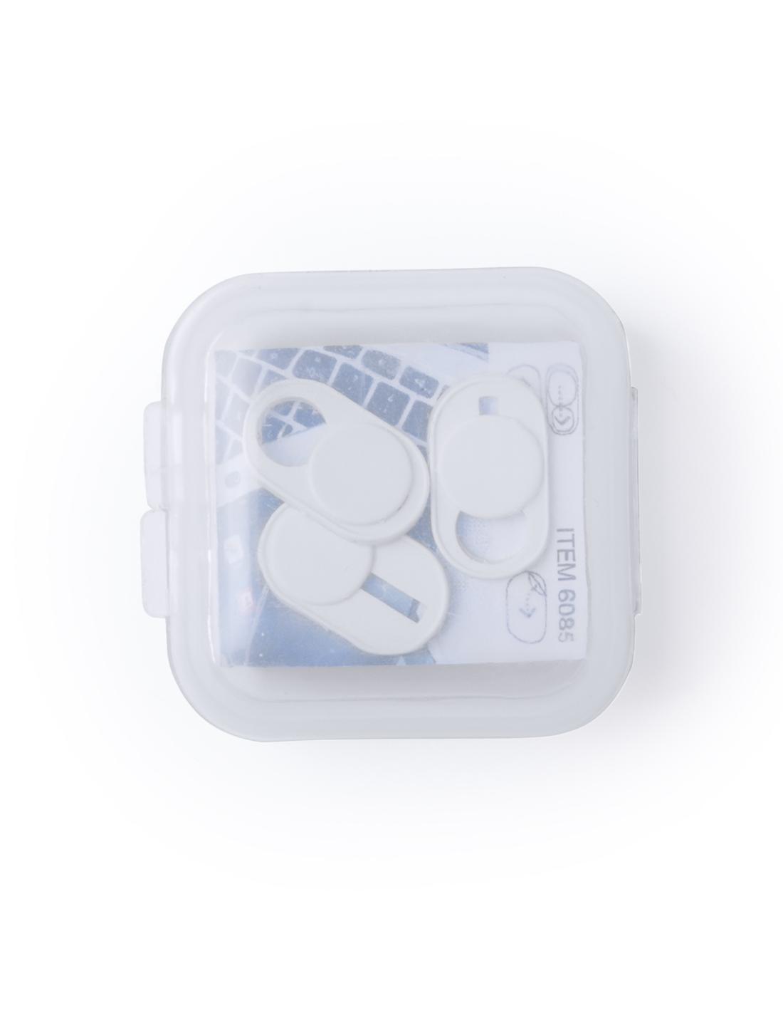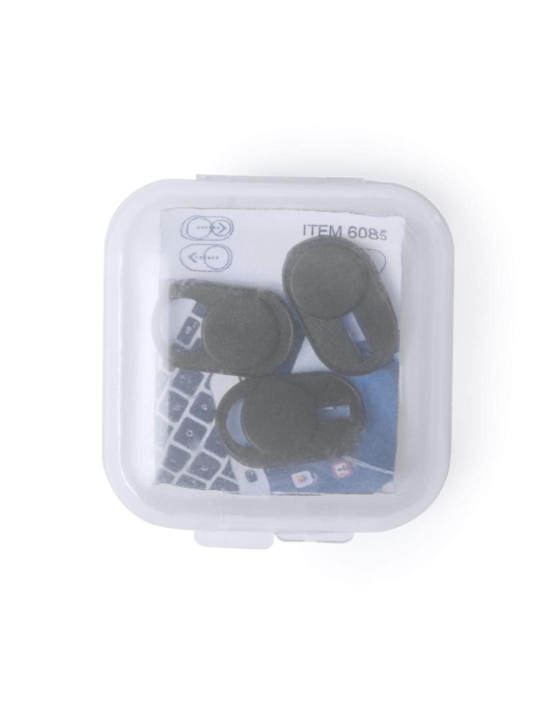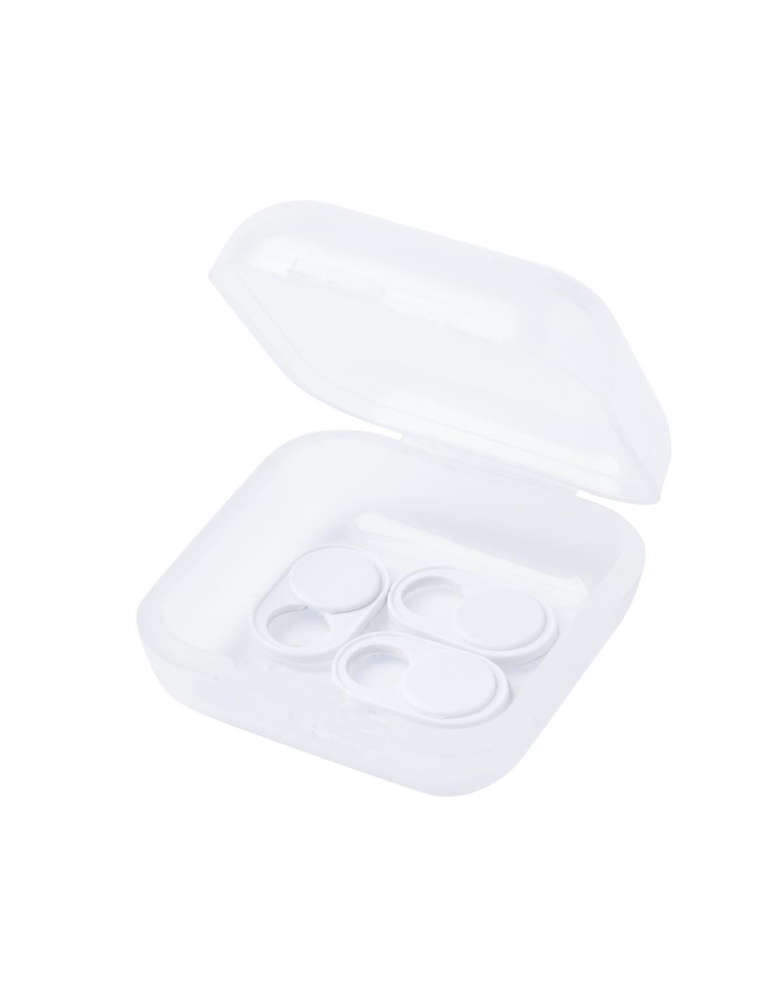 Tapa para cámara de dispositivo móvil para proteger la privacidad. En tamaño ultra compacto y servida en estuche individual de achado translúcido con 3 piezas. Disponible en colores blanco y negro, set presentado en bolsita individual con cartulina de diseño.