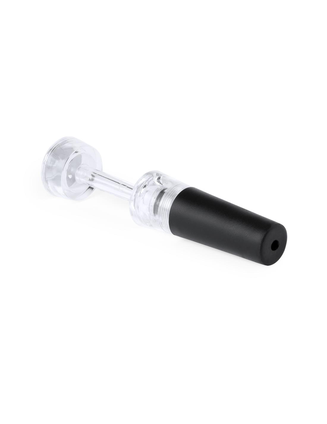 Tapón con bomba de vacío para botellas de vino en elegante diseño de color negro y transparente. Parte superior del tapón metálica para marcaje en láser o tampografía. Presentado en caja individual.