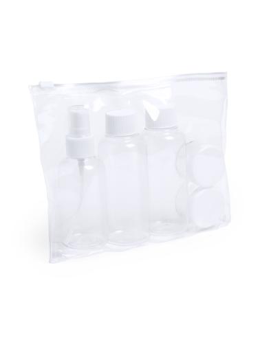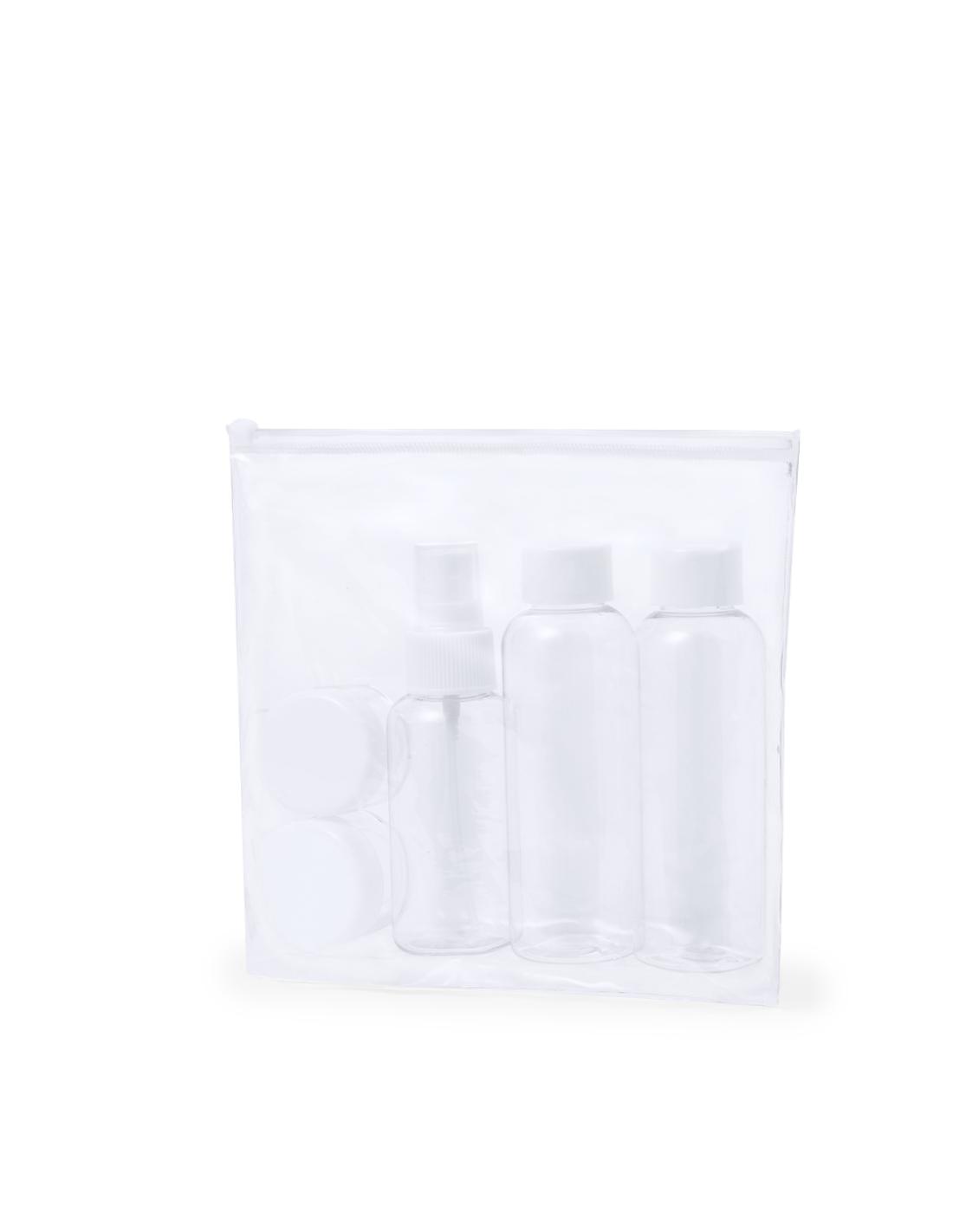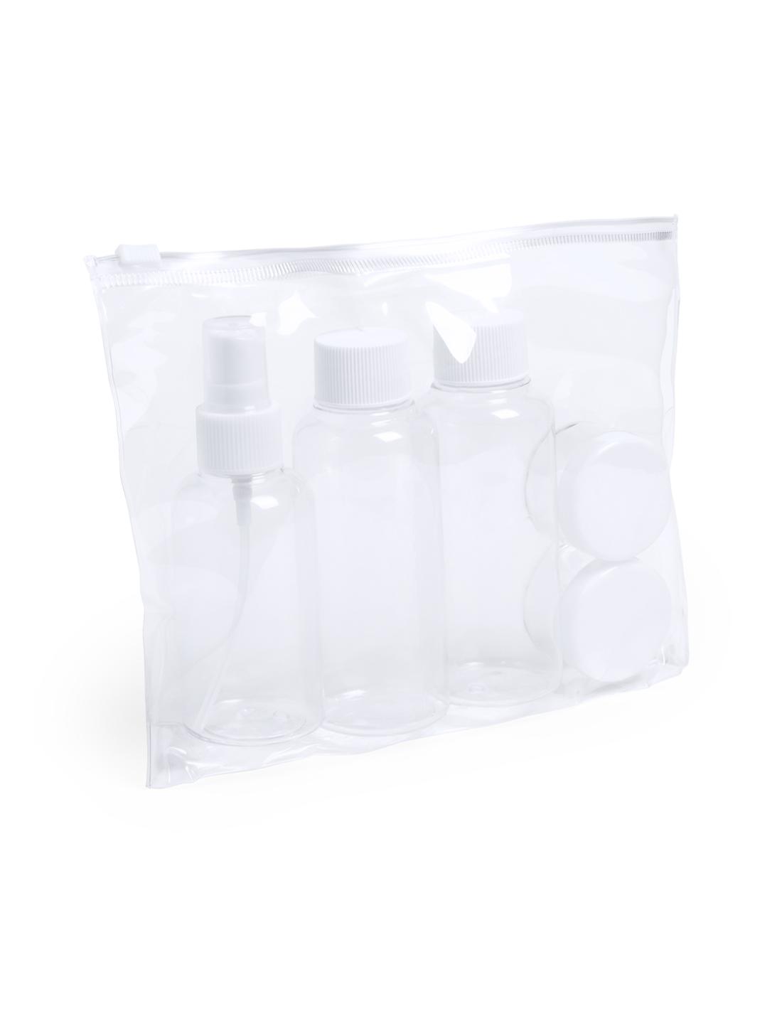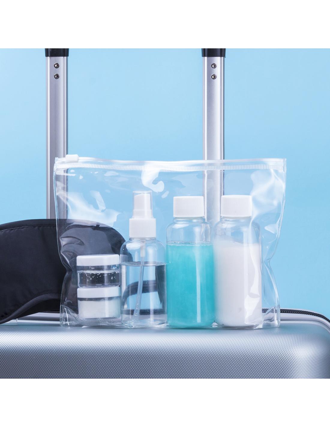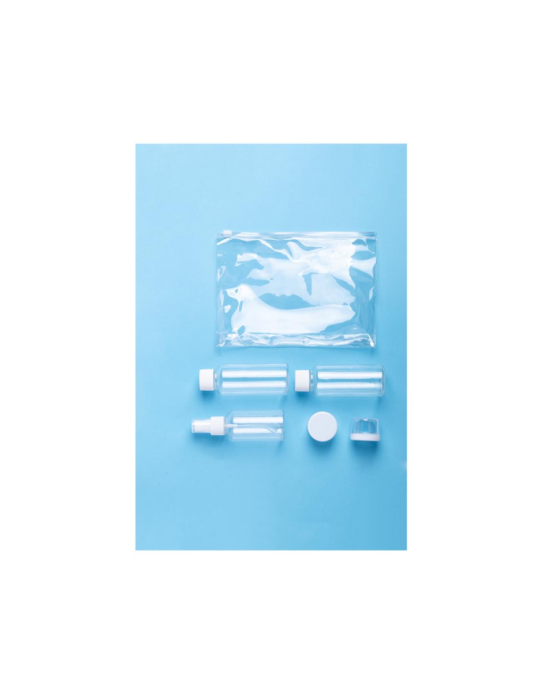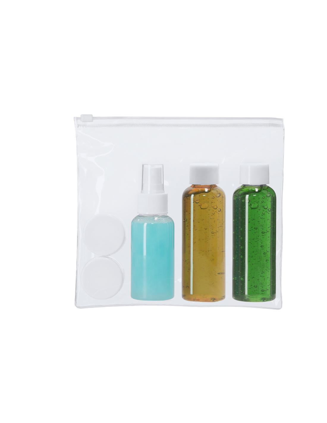 Set neceser de viaje de 5 accesorios en diseño transparente. Incluye dos botes para gel y champú con tapón a rosca, perfumador y dos tarritos para crema. Presentado en estuche de PVC con cierre hermético a juego.