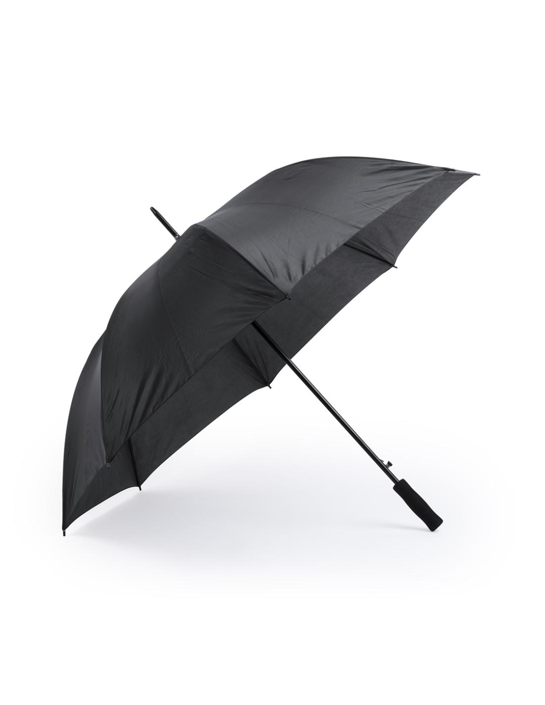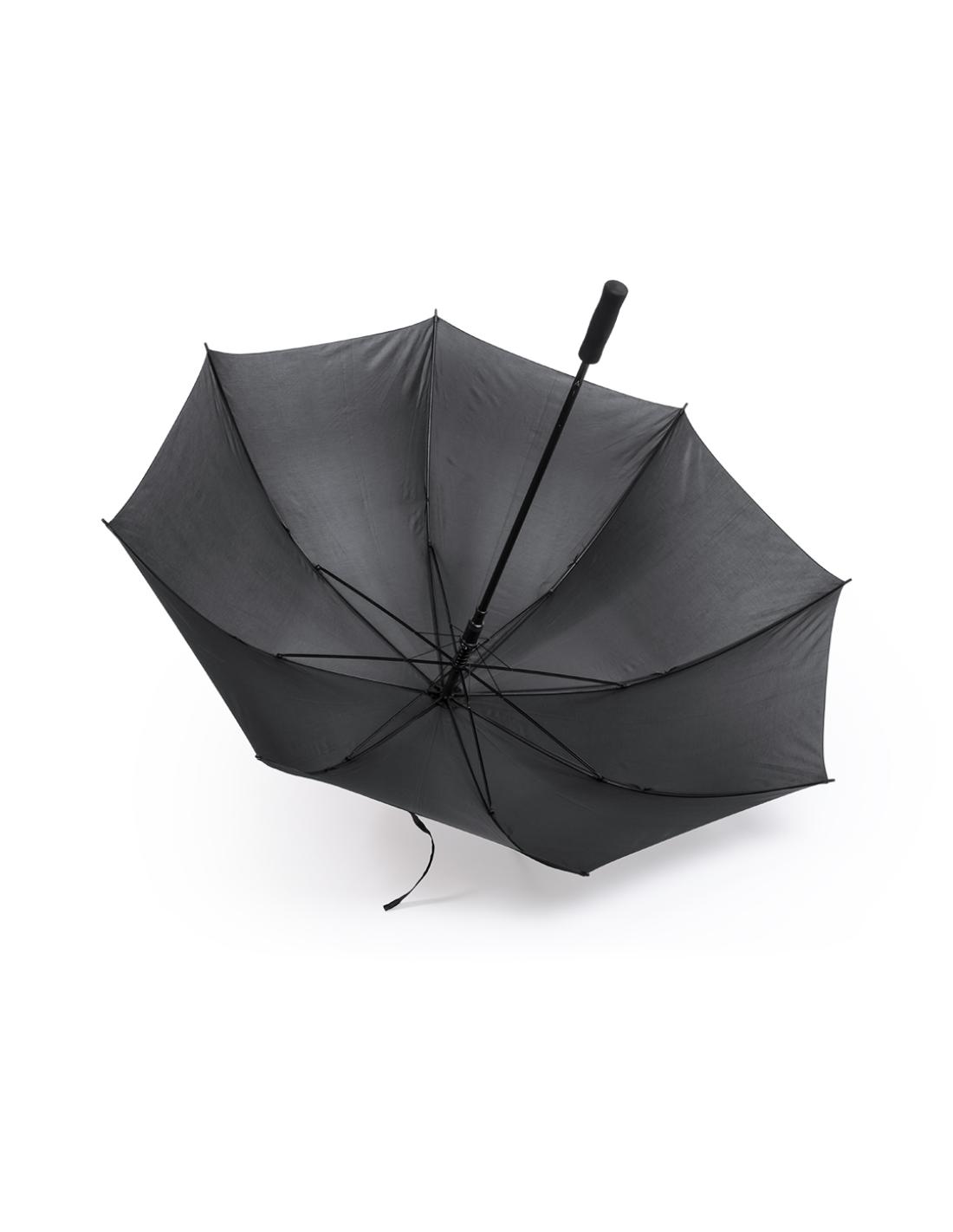 Paraguas de 8 paneles tamaño XL -130cm diámetro- con sistema antiviento. Apertura automática, en resistente poliéster y con varillas de fibra en color negro. Con mango acolchado de EVA y cierre de velcro. Disponible en extensa gama de colores.