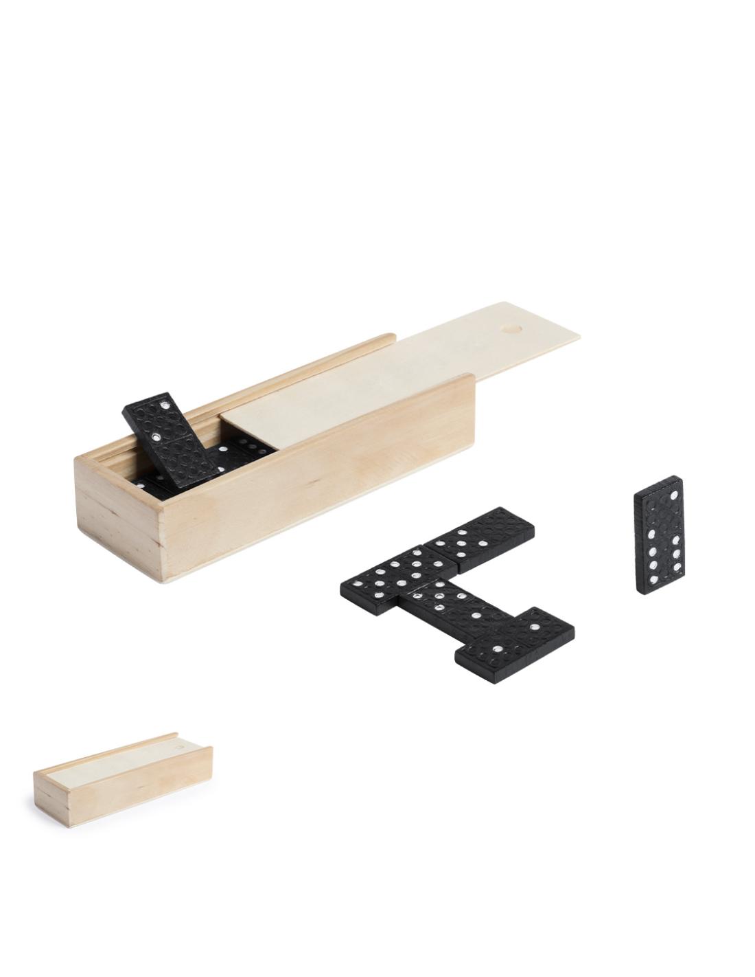 Dominó clásico de 28 piezas fabricado en madera. Piezas en sobrio diseño de color negro con detalle en blanco. Presentado en estuche individual de madera con tapa.