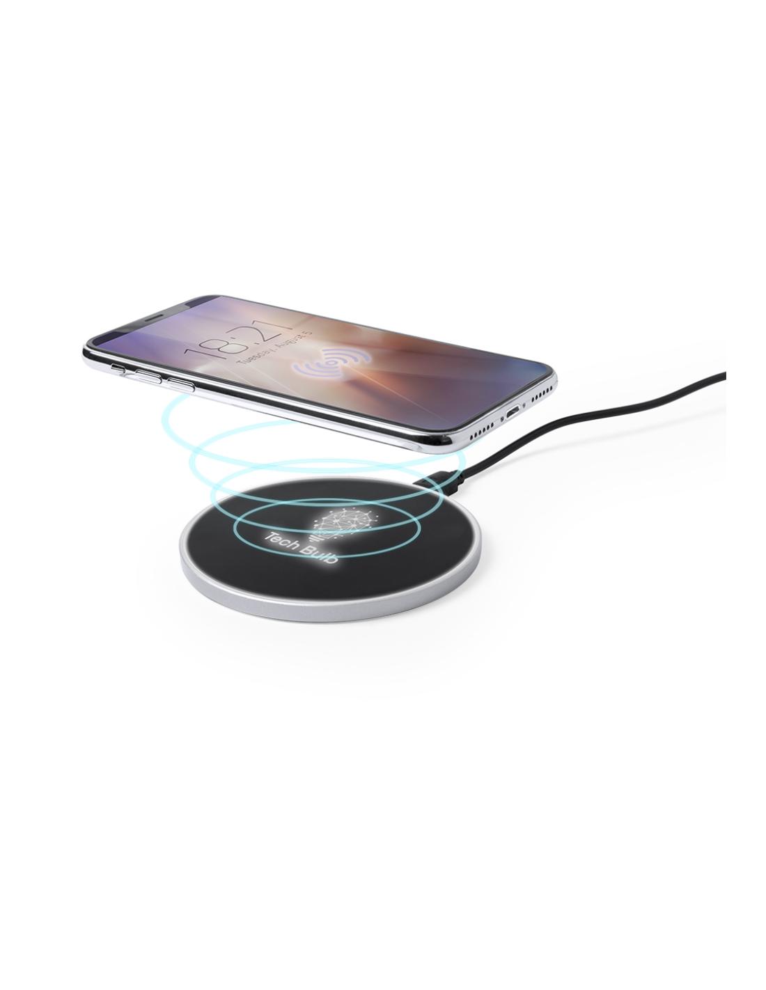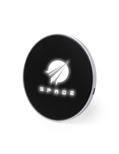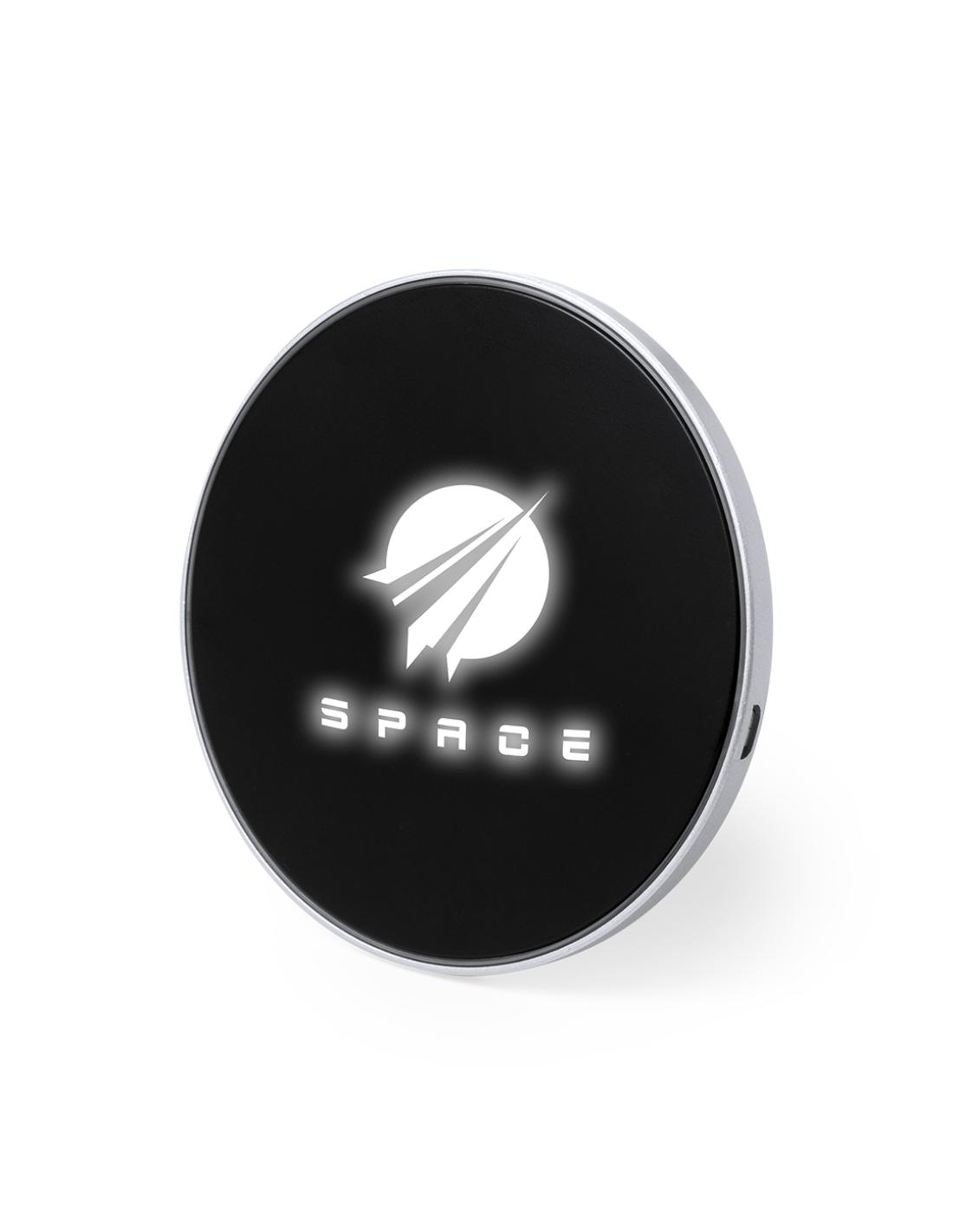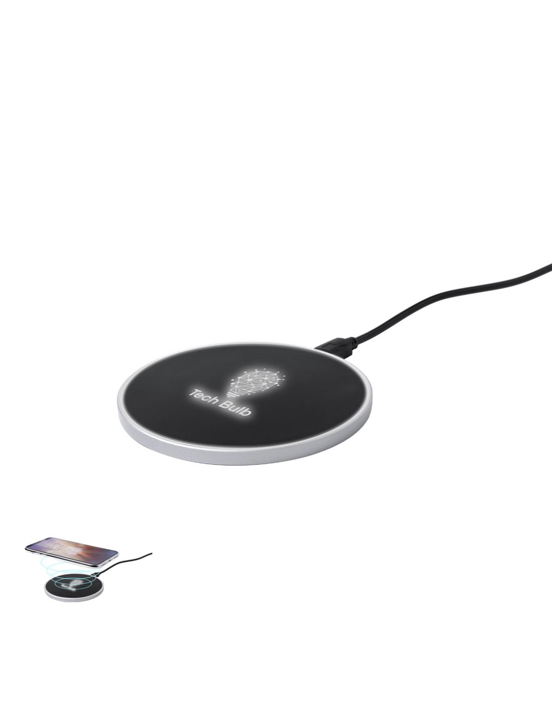 Cargador inalámbrico circular. En elegante color negro, con luz led interior y un recubrimiento exterior especialmente diseñado para marcaje en láser, con el que conseguirá que su publicidad o marca quede iluminada con luz blanca. Base antideslizante y compatible con dispositivos equipados con tecnología de carga inalámbrica. Presentado en atractiva caja de diseño. Cable USB incluido.