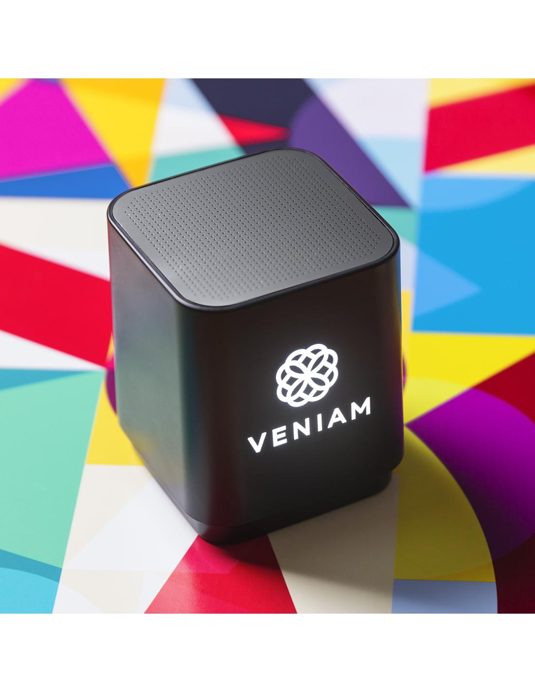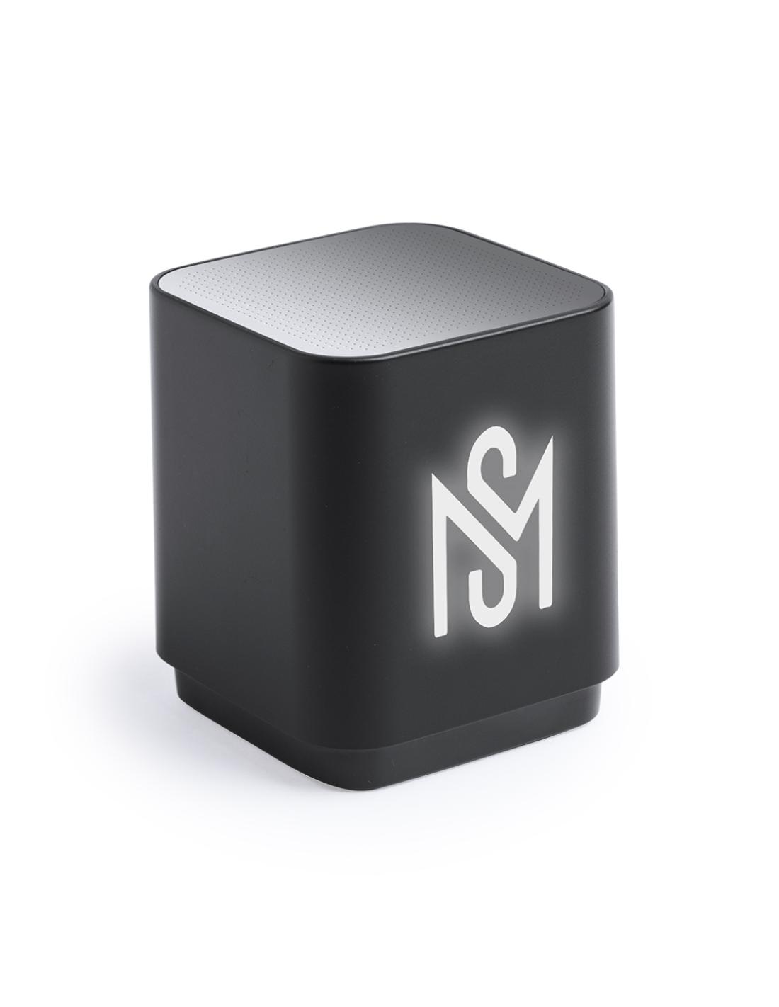 Altavoz con conexión Bluetooth, luz led interior y cuerpo especialmente diseñado para marcaje en láser, iluminando así el logotipo. Con 3W de potencia y función manos libres. Recargable mediante cable USB -incluido- y presentado en una atractiva caja de diseño.