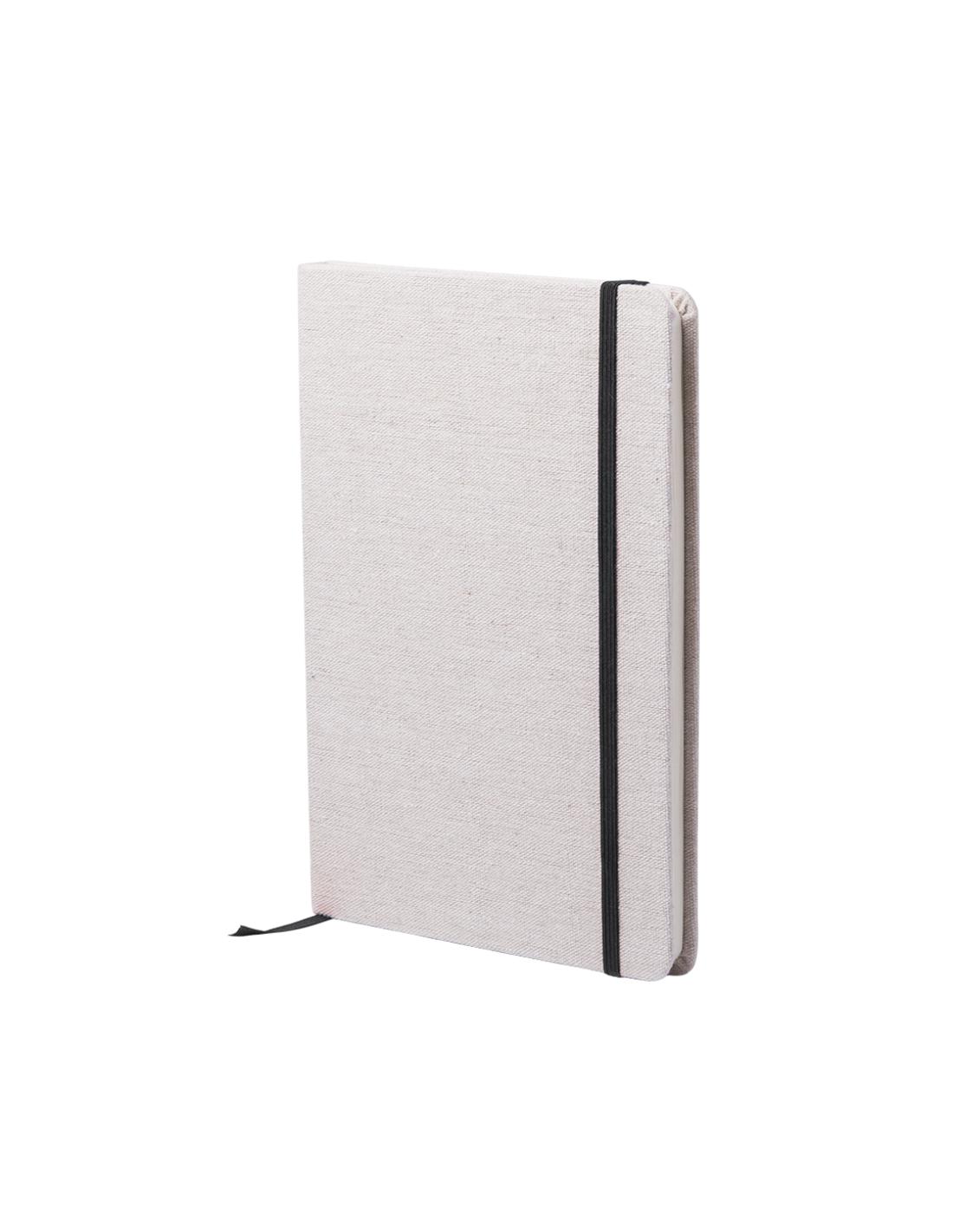 Bloc de notas de materiales naturales. Tapas en suave algodón de color crudo, con elástico de cierre y marcapáginas a juego en vivos colores. Incluye 80 hojas lisas.