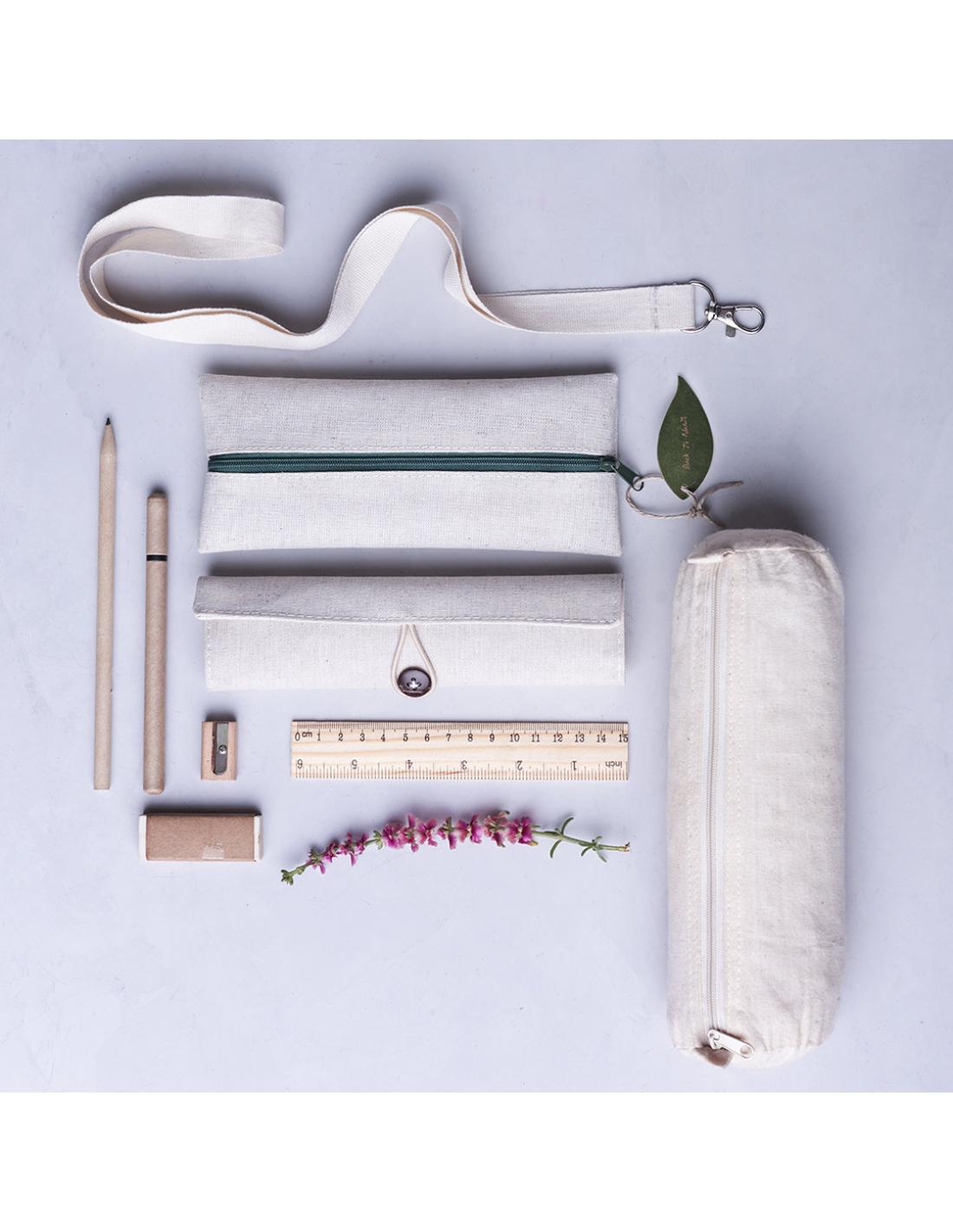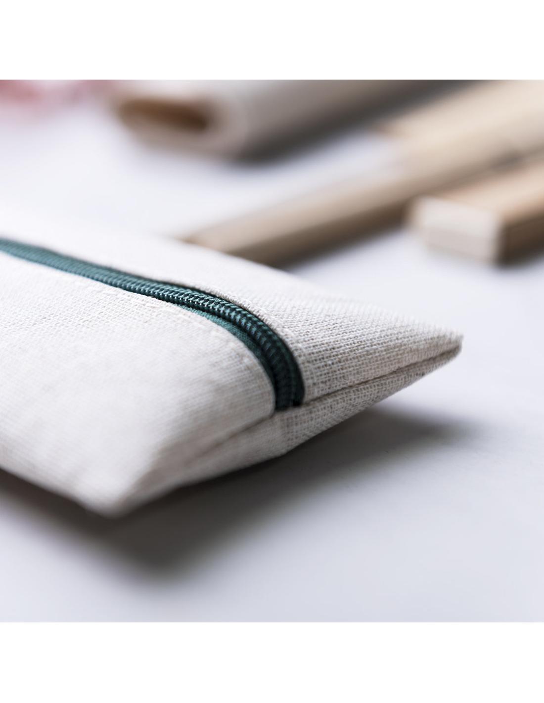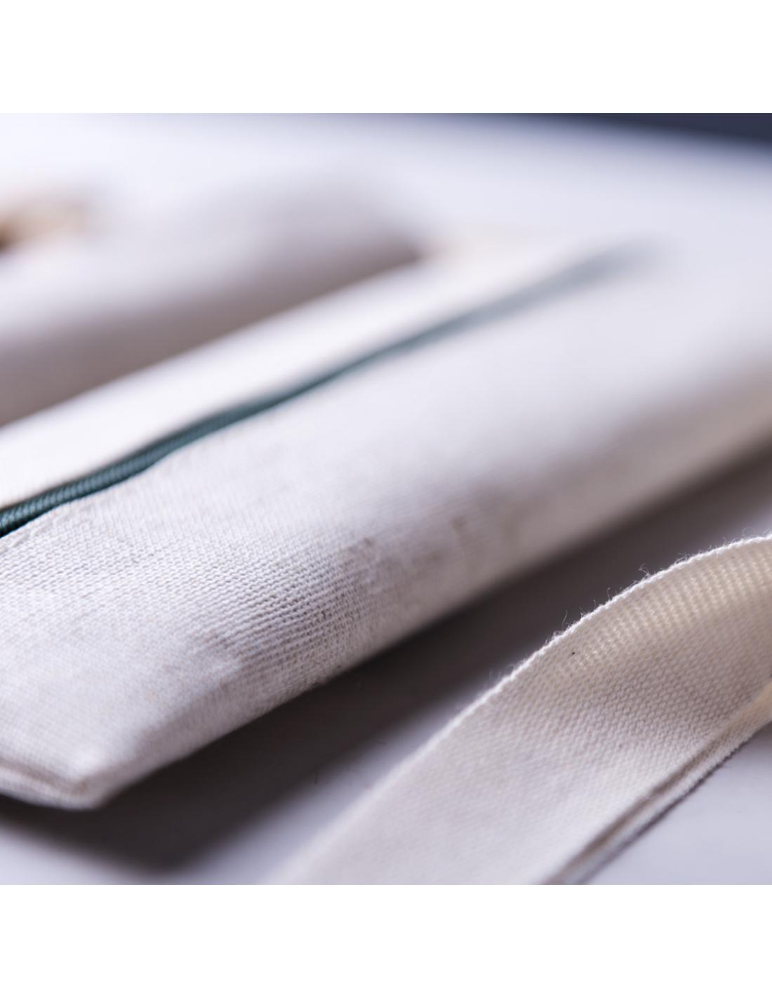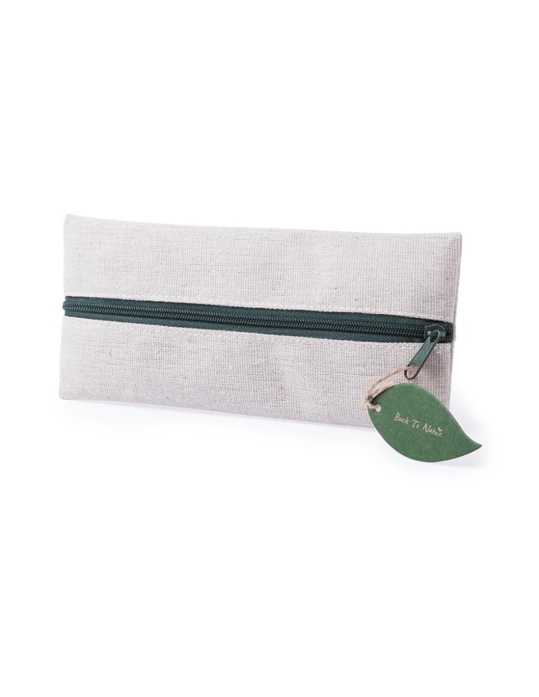 Práctico estuche de línea nature. De tamaño compacto en combinación de materiales yute y algodón. Con cierre de cremallera y hojita para publicidad en tirador.