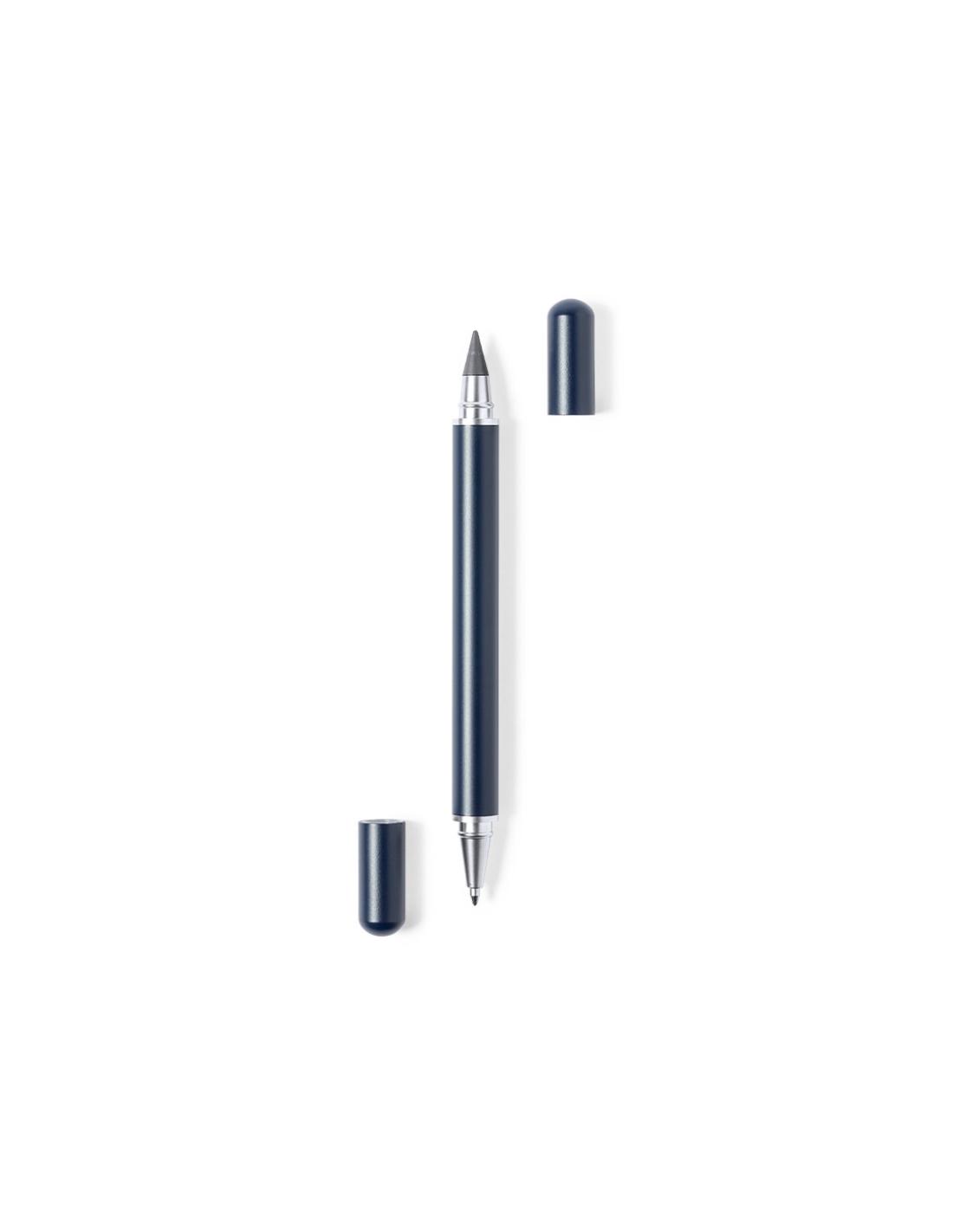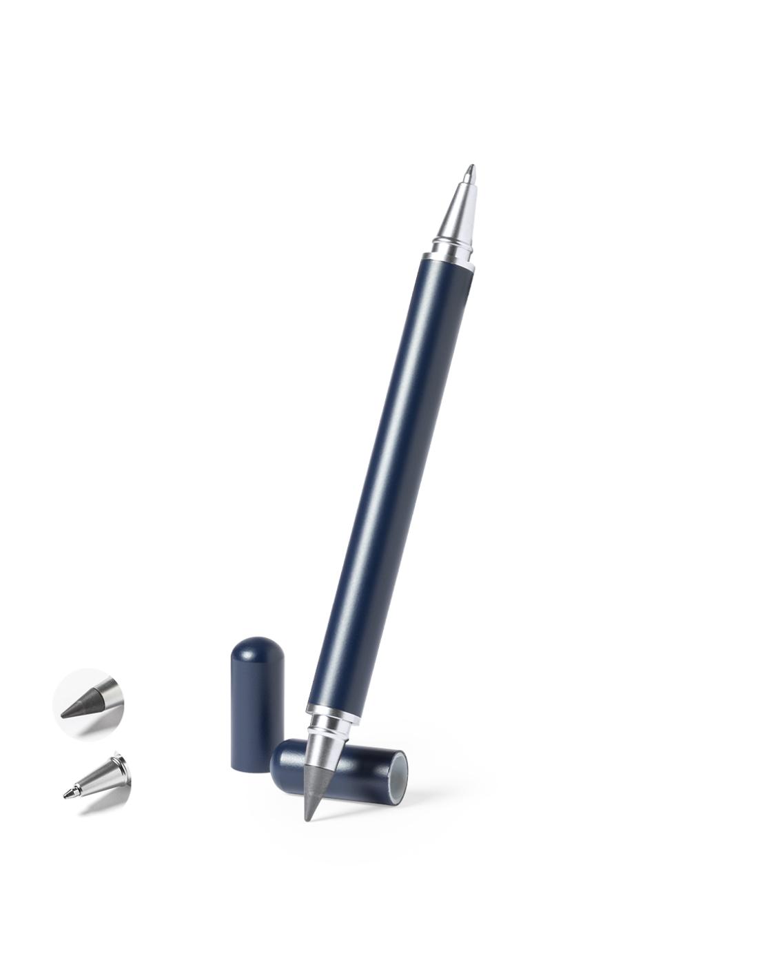 Bolígrafo lápiz eterno 2 en 1, fabricado en resistente metal de acabado brillo. Con cierre de capucha, incluye bolígrafo en un extremo (carga jumbo y tinta azul), y lápiz eterno en el otro extremo, para así usar siempre el mismo lápiz y no generar residuos. Presentado en estuche individual negro.