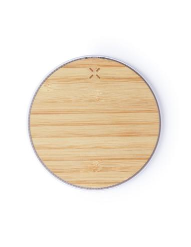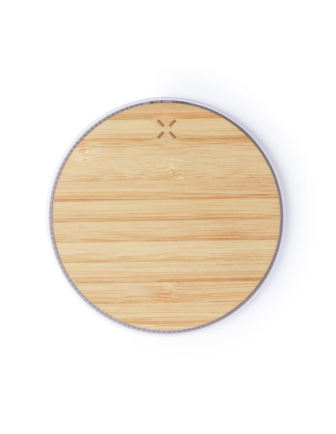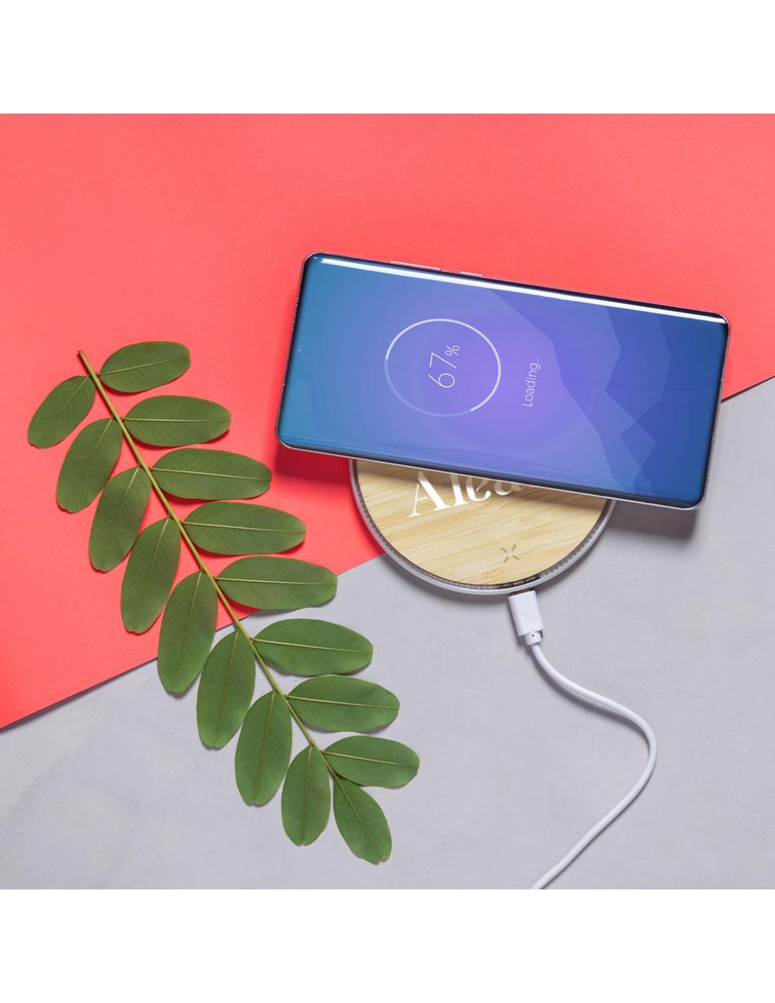 Cargador inalámbrico de línea nature, con base de carga en madera de bambú. Base antideslizante y compatible con dispositivos equipados con tecnología de carga inalámbrica. Presentado en atractiva caja de diseño. Cable USB incluido.