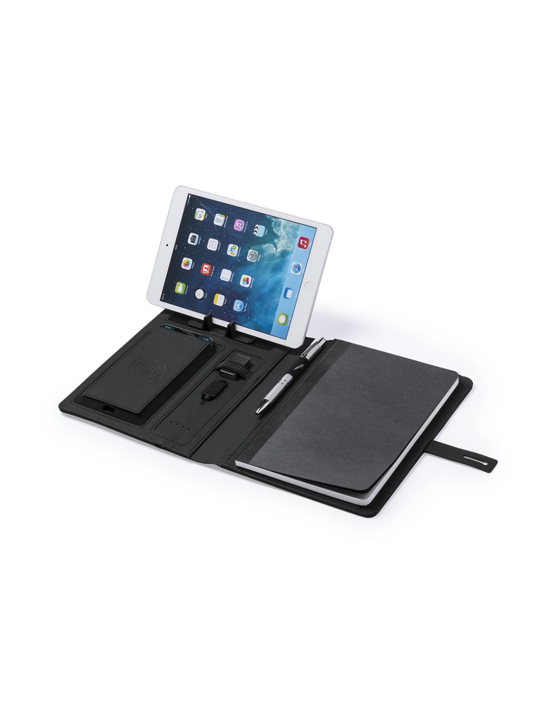 Elegante y práctico organizador en poliéster 300D. Con carga inalámbrica y batería auxiliar de 4.000 mAh de capacidad de carga integrada. De sobrio diseño y original cierre, incluye bloc de notas de 64 hojas, soporte para bolígrafo e indicador led de estado de carga. El fácil acceso a la estación de carga mediante cable micro USB -incluido- hacen de este organizador el gadget perfecto para el mundo de los negocios. Las capacidades mostradas en todas nuestras baterías auxiliares externas son reales, incorporando todas ellas baterías de grado A y no recicladas, con una vida útil de al menos 500 ciclos de carga y según normativa CE. Además, están fabricadas conforme a los estándares RoHS y en cumplimiento con los siguientes requisitos de seguridad: Sistema de protección contra sobrecarga del power bank.