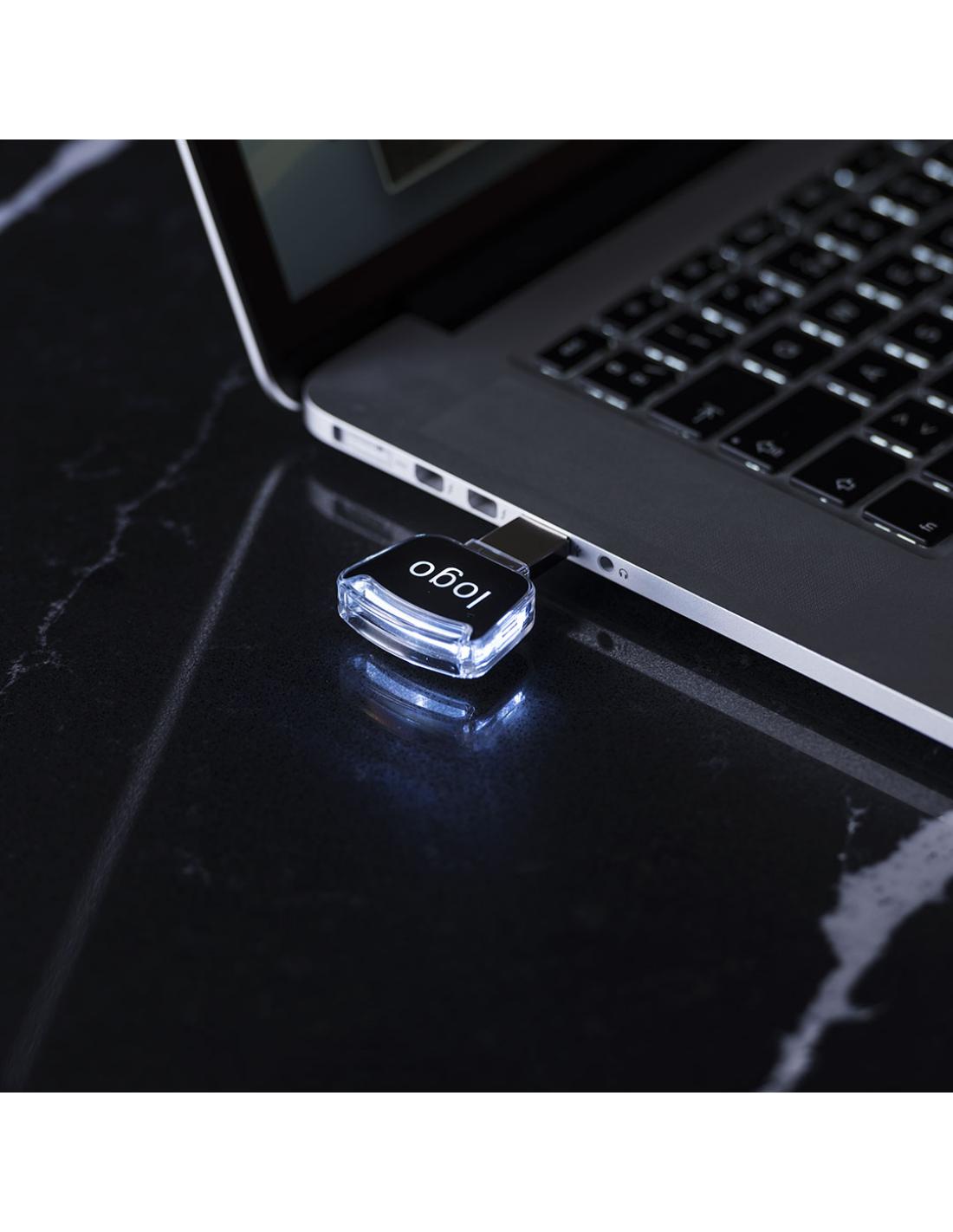 Memoria USB de 16GB de capacidad. De innovador diseño automovilístico, con luz led interior y cuerpo especialmente diseñado para marcaje en láser, iluminando así el logotipo. Presentada en estuche individual.