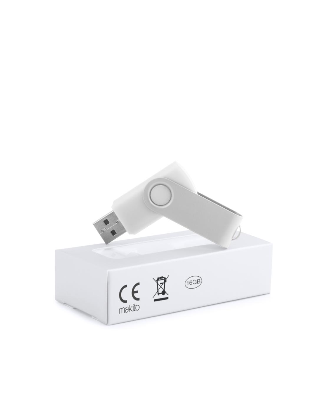 Memoria USB de 16GB de capacidad, con mecanismo giratorio, cuerpo de suave acabado y clip metálico a juego en acabado brillante. Presentada en estuche individual.