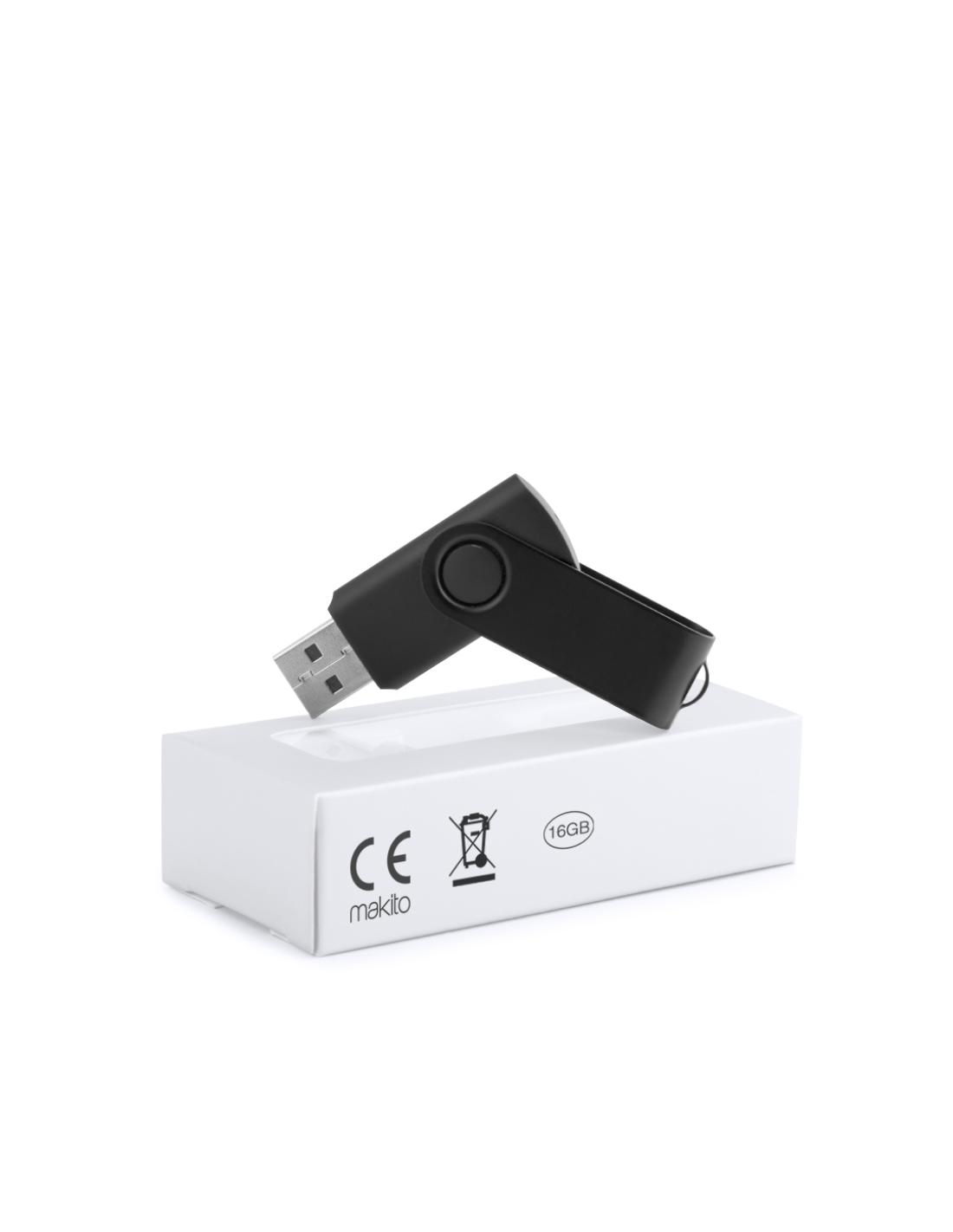 Memoria USB de 16GB de capacidad, con mecanismo giratorio, cuerpo de suave acabado y clip metálico a juego en acabado brillante. Presentada en estuche individual.