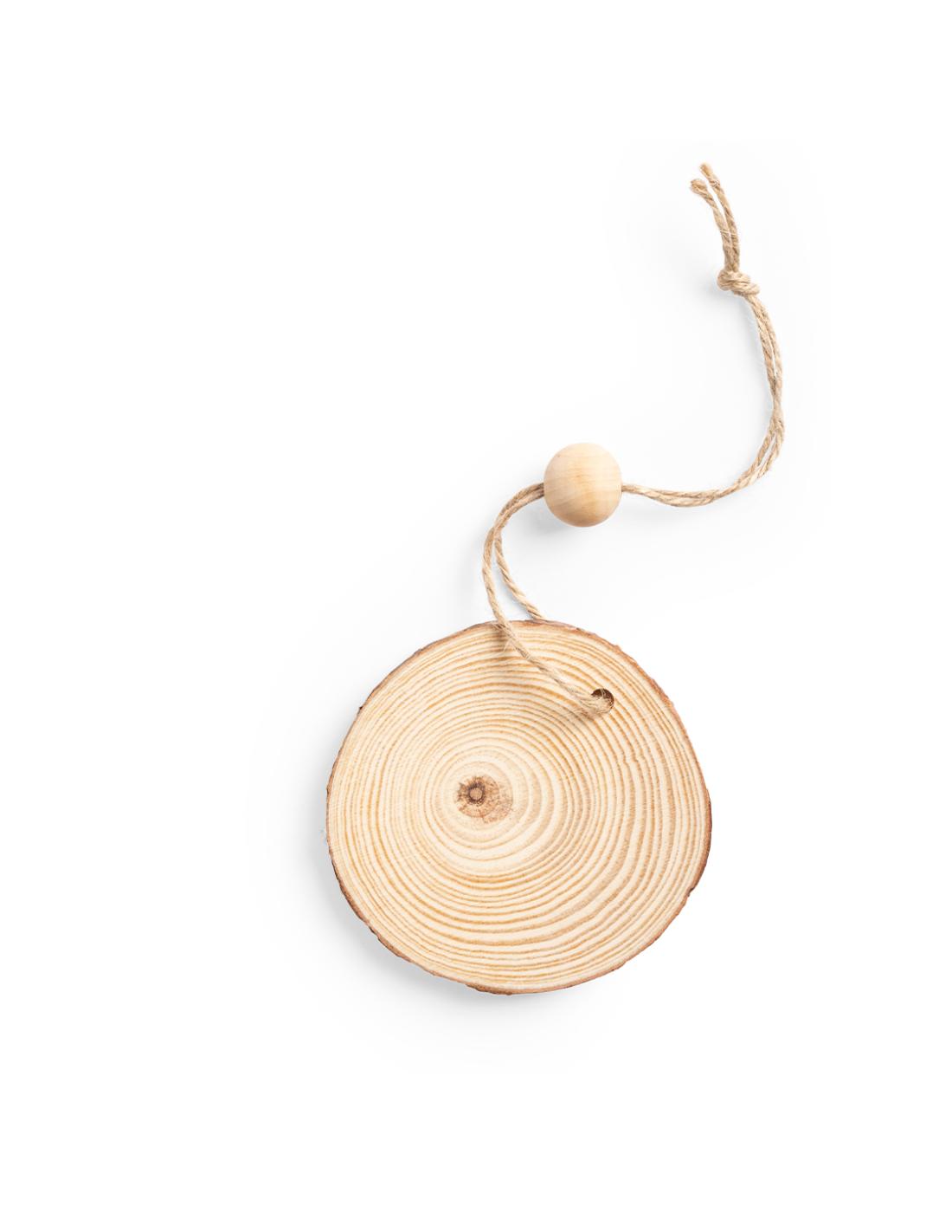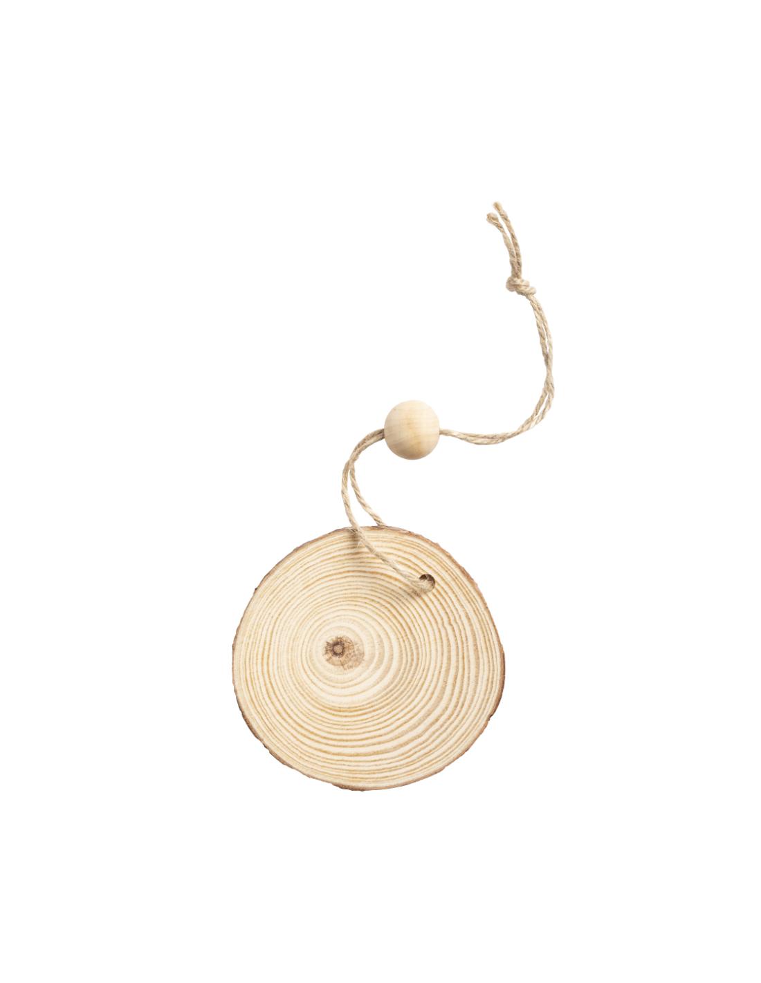 Adorno navideño en madera natural al corte, con lacito para colgar y bola a juego. Ideal para marcaje en láser.