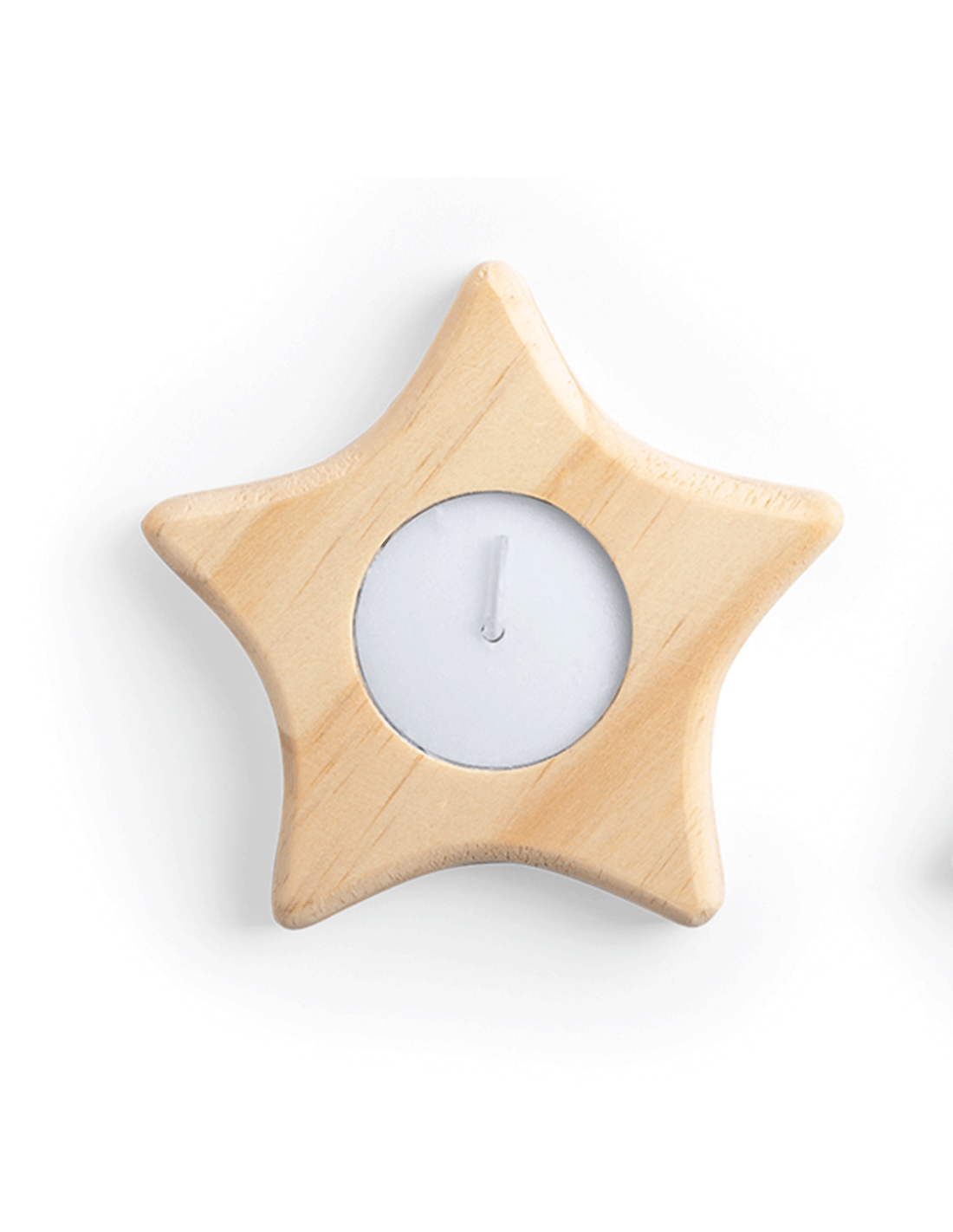 Vela de navidad de madera de pino con originales diseños de estrella y arbolito. Presentada en cajita blanca individual.
