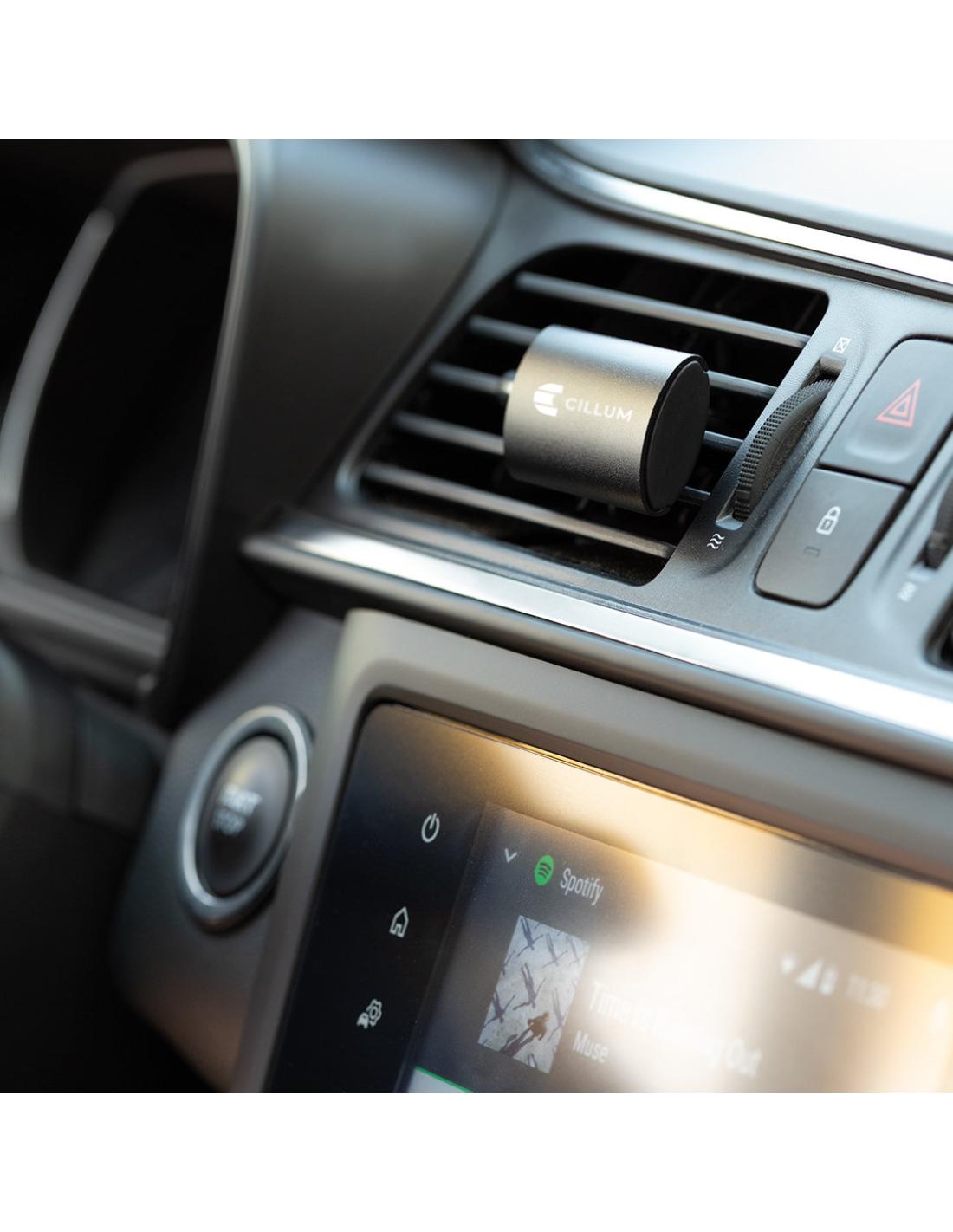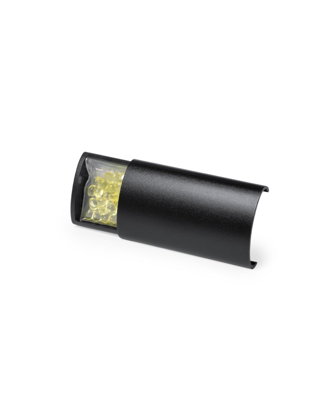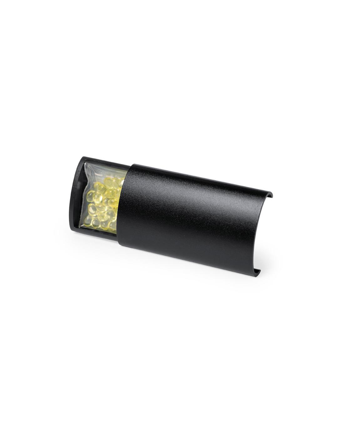 Ambientador para rejilla de coche en elegante diseño. Con frontal deslizante en aluminio granulado y resistente pinza para rejilla. Con bolitas de perfume de aroma limón y disponible en acabados plateado y negro.