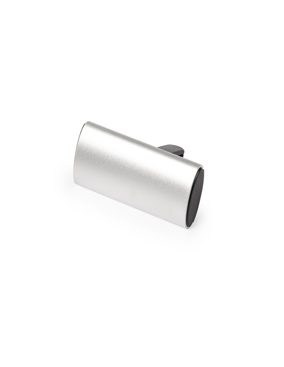 Ambientador para rejilla de coche en elegante diseño. Con frontal deslizante en aluminio granulado y resistente pinza para rejilla. Con bolitas de perfume de aroma limón y disponible en acabados plateado y negro.