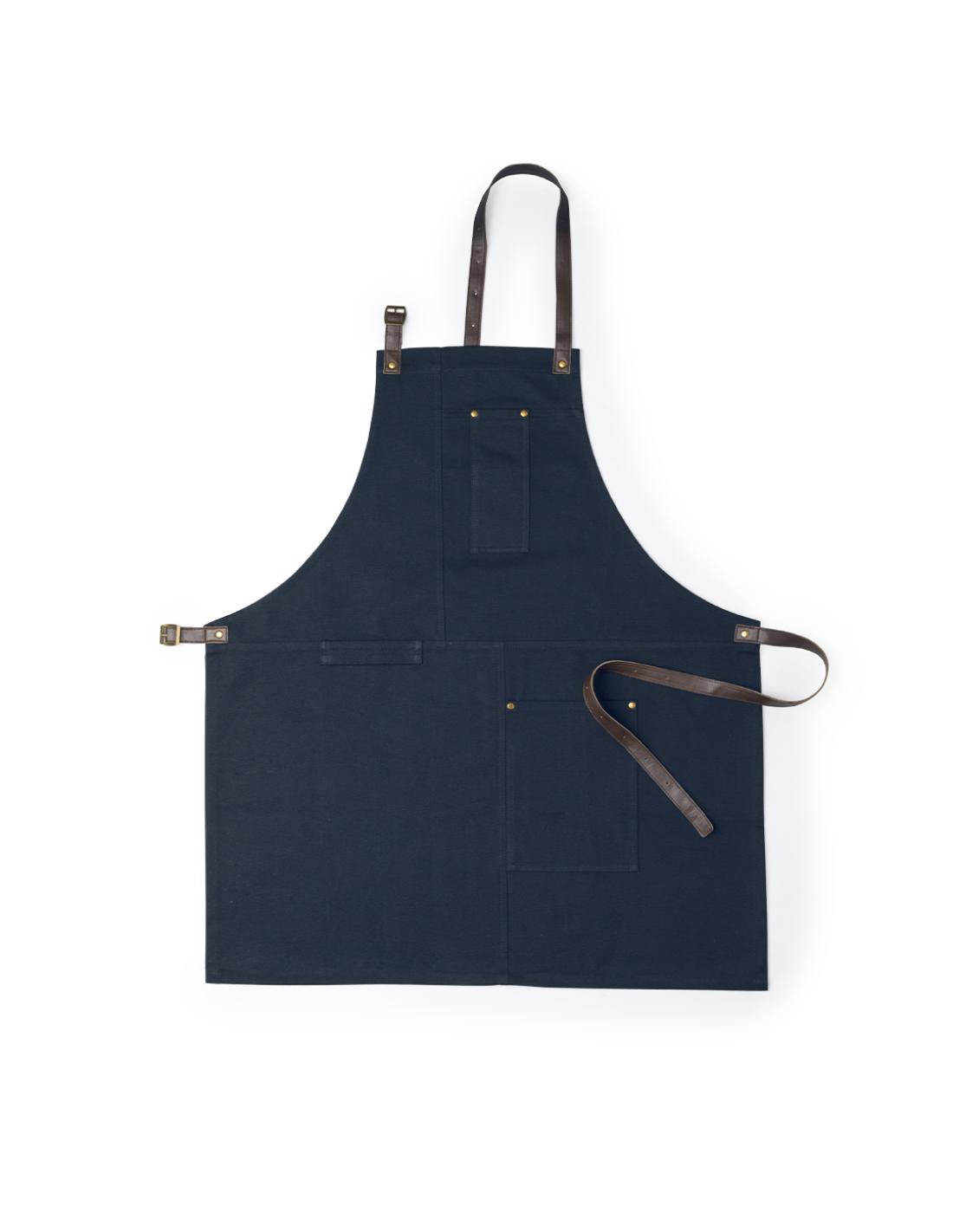 Delantal pro de alta calidad en resistente material 100% algodón canvas de 340g/m2. De corte por debajo de la rodilla, con cintas de cuello y cintura en resistente polipiel con ajuste mediante hebilla y reforzado con remaches metálicos. Incluye multitud de bolsillos para los distintos utensilios, con las costuras reforzadas.