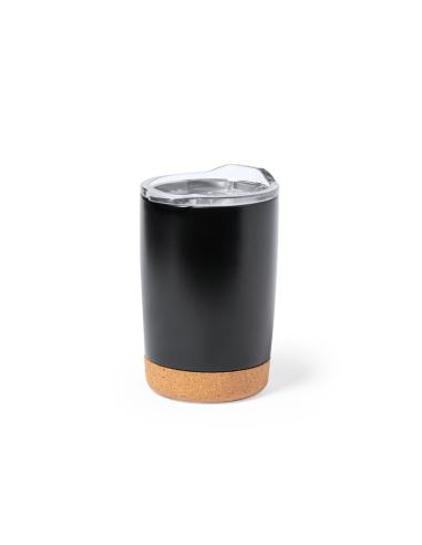 Vaso de sobremesa fabricado en combinación de base en corcho natural con cuerpo en acero inox de acabado blanco, de 380 ml de capacidad. Con doble cobertura para mejor y mas duradera conservación de la temperatura y original tapón dosificador con abrefácil transparente. Presentado en atractiva caja de diseño.