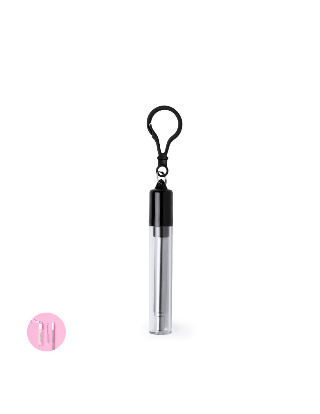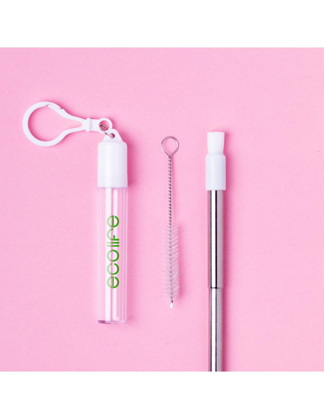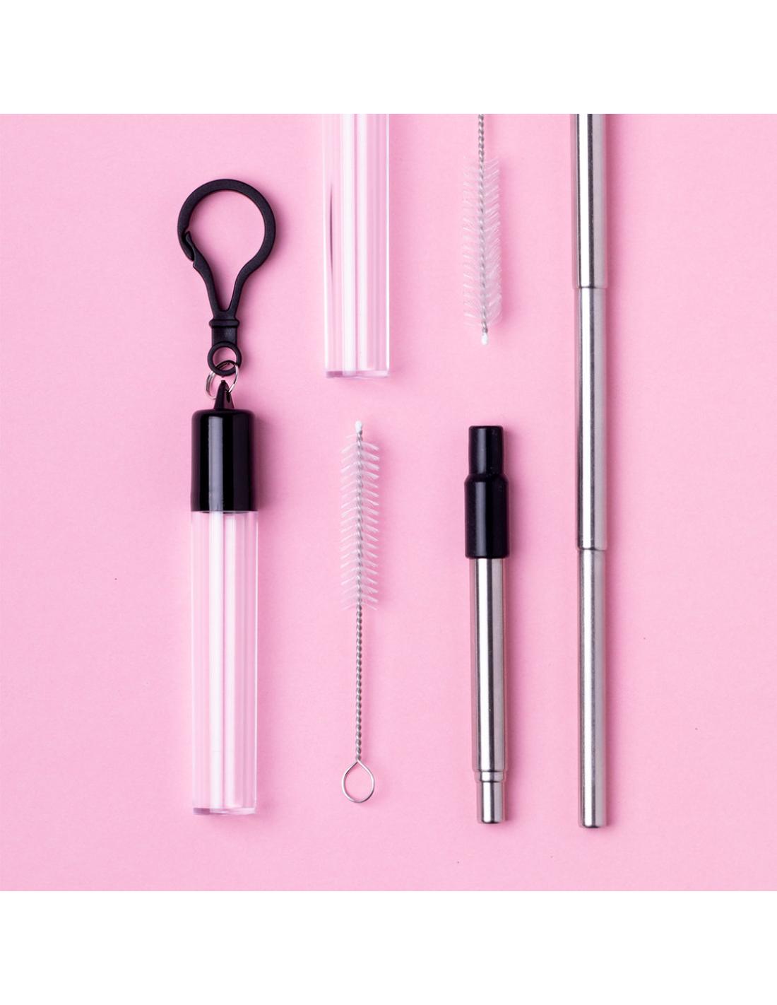 Pajita reutilizable y extensible en acero inoxidable, con boquilla de silicona. Con accesorio limpiador incluido y presentada en estuche transparente con accesorio para transporte.