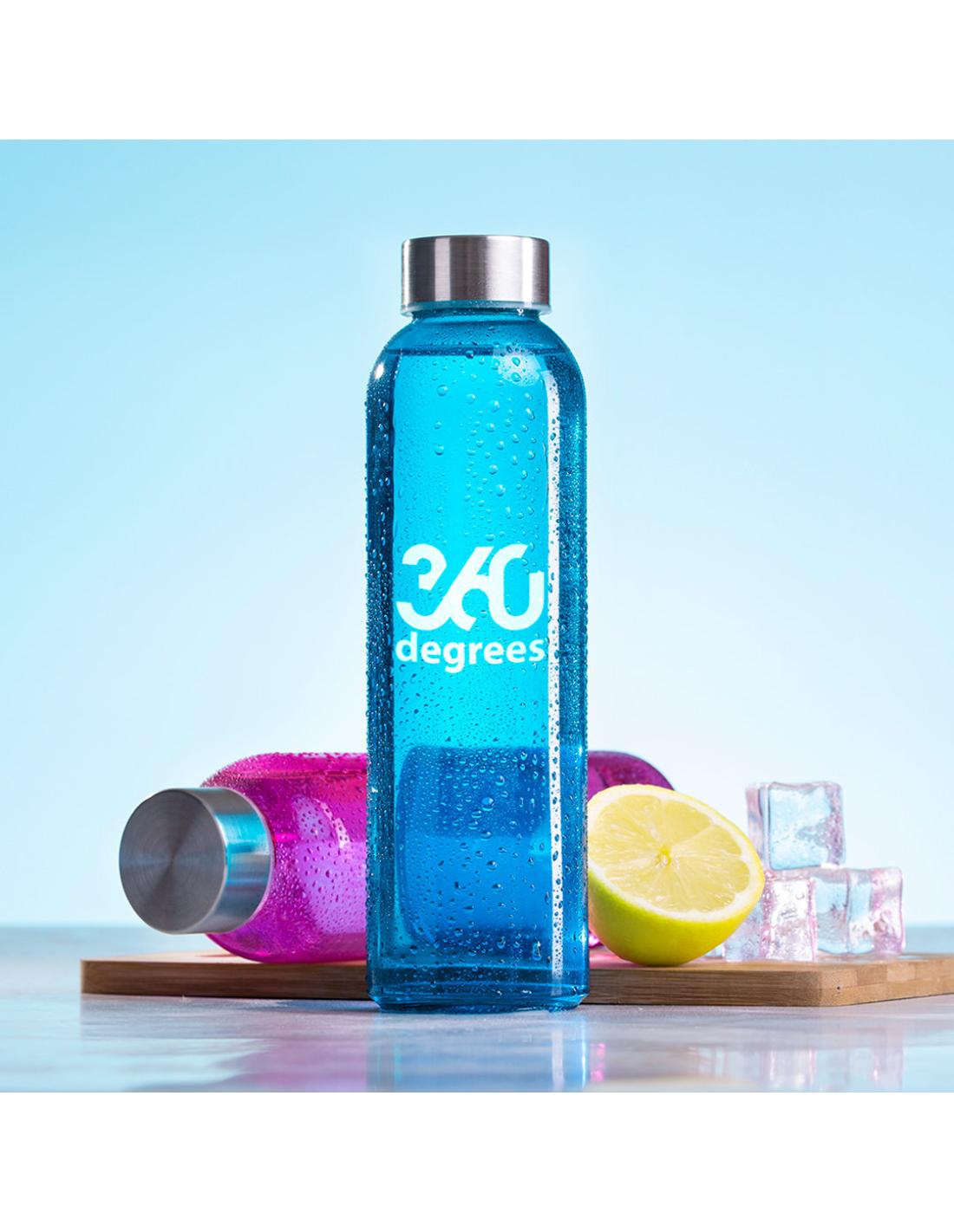 Bidón de cristal en alta calidad, de 500ml de capacidad, con cuerpo de acabado transparente en material libre de BPA y tapón a rosca en acero inox. Disponible en variada gama de colores. Presentado en atractiva caja de diseño.