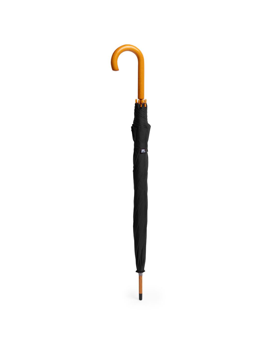 Paraguas de línea nature de 105cm de diámetro. En material pongee 190T RPET, elaborado a partir de plástico reciclado, para así fomentar la reutilización de residuos plásticos y ayudar a la sostenibilidad del planeta. De apertura automática y varillas metálicas. Mango y caña de madera, con etiqueta distintiva RPET