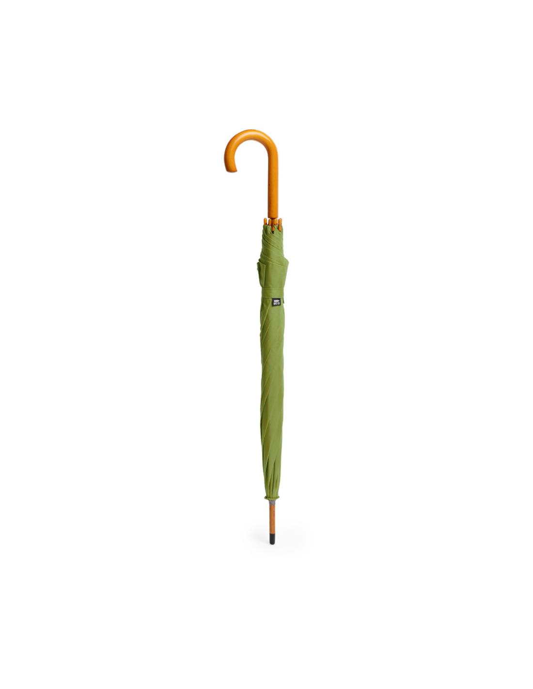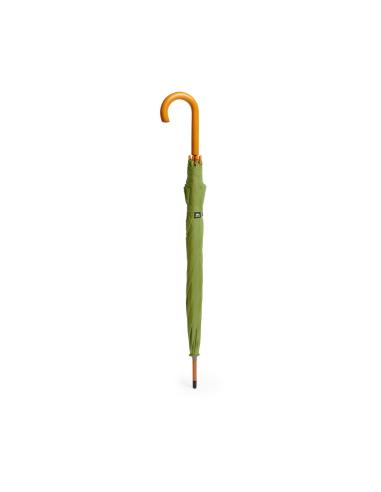 Paraguas de línea nature de 105cm de diámetro. En material pongee 190T RPET, elaborado a partir de plástico reciclado, para así fomentar la reutilización de residuos plásticos y ayudar a la sostenibilidad del planeta. De apertura automática y varillas metálicas. Mango y caña de madera, con etiqueta distintiva RPET