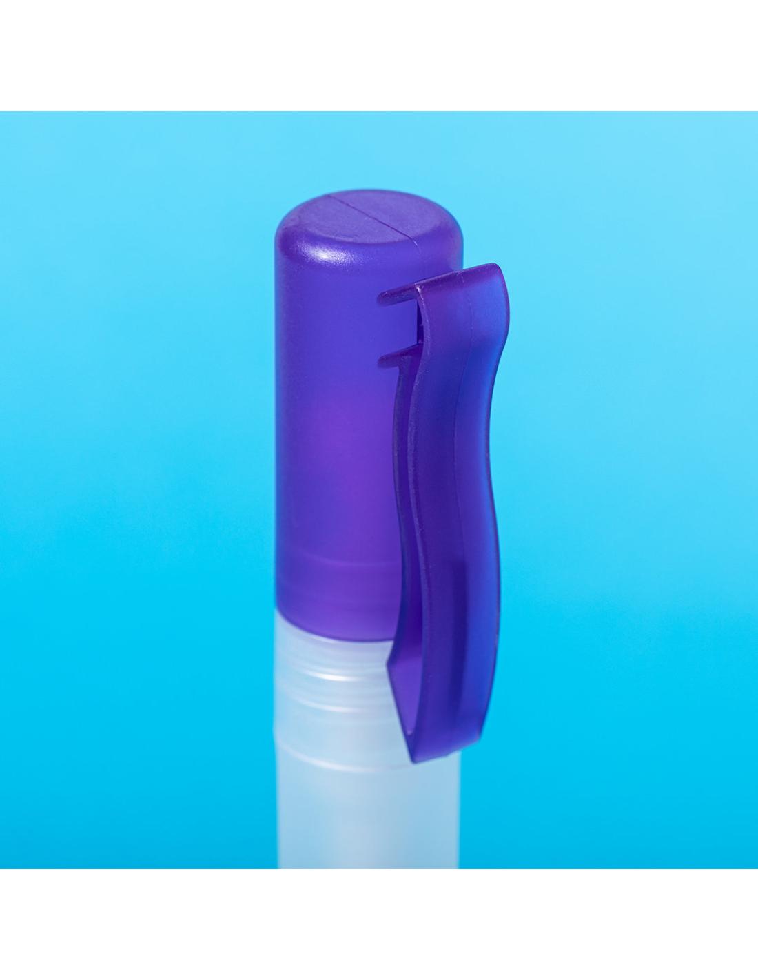 Spray hidroalcohólico para higiene y limpieza de la piel en bote rellenable de 10 ml. Cuerpo en translúcido y capucha disponible en variada gama de colores, con clip de ajuste. Solución con 65% de contenido de alcohol.Artículo con certificación GMP (Good Manufaturing Practices / Normas de Correcta Fabricación) que garantiza el cumplimiento de rigurosas medidas de control para la obtención de un producto seguro y de calidad.