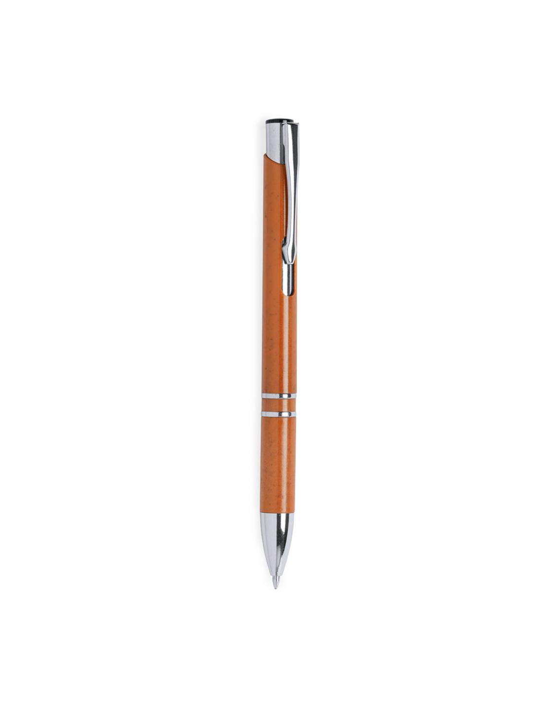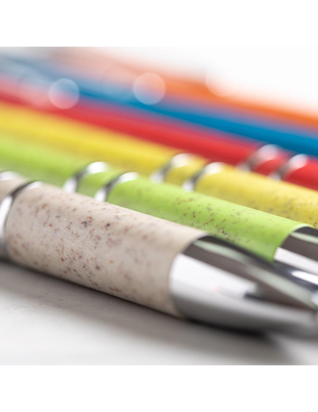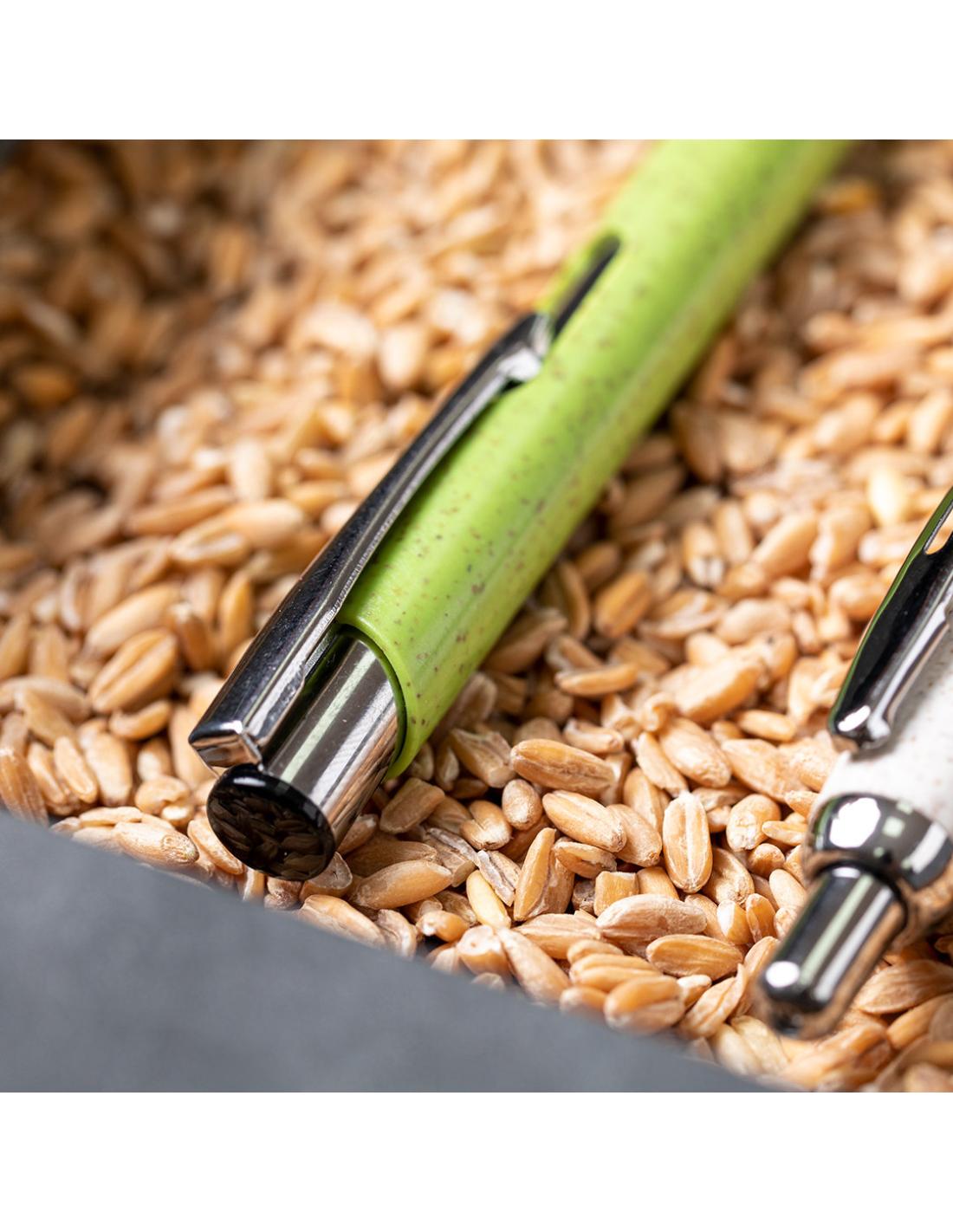 Bolígrafo de línea nature con cuerpo en caña de trigo, para así fomentar la utilización de materias primas naturales y reducir las emisiones contaminantes. Clip metálico y accesorios en cromado. De mecanismo pulsador, de cartucho jumbo y con tinta azul. Disponible en variada gama de colores nature.