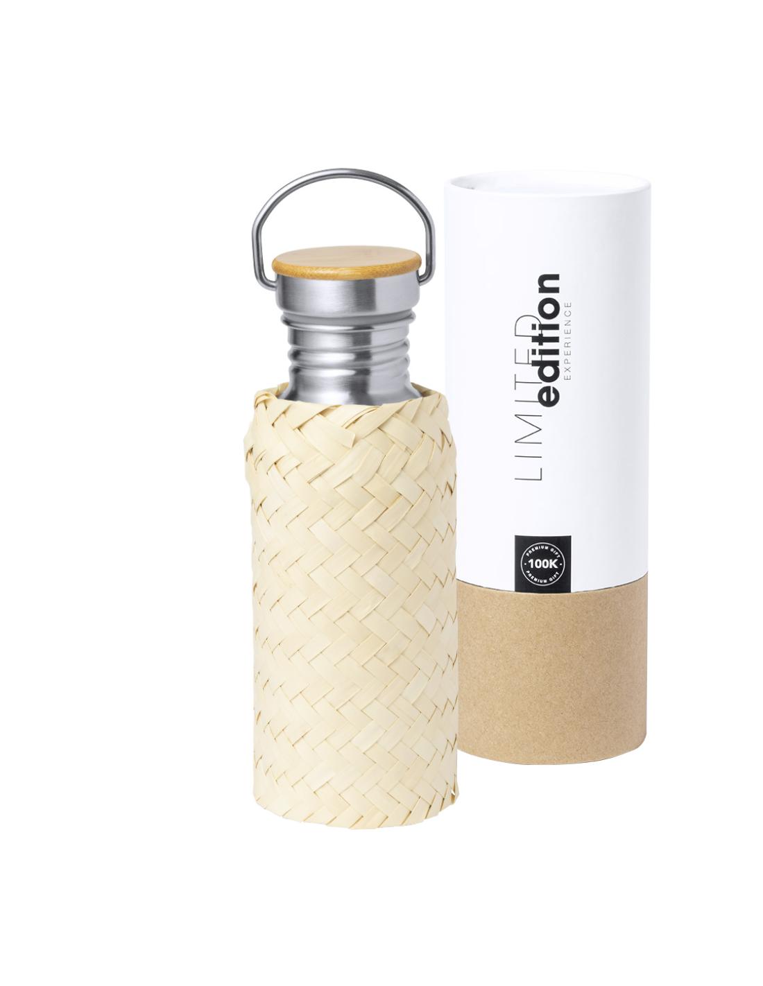 Bidón Limited Edition. Envuelto en un ecodiseño de líneas suaves, este bidón combina cuerpo en acero inoxidable, funda de paja y tapón de seguridad a rosca con base de bambú. Incluye asa de transporte. De 600ml de capacidad. De la perfecta combinación entre exclusividad y diseño, nace Limited Edition, una colección especial de ideas promocionales de edidición limitada. Un nuevo concepto, inspirado en la fusión de artículos premium con las últimas y más novedosas tendencias y que cuenta con una seleción limitada de unidades, convirtiendo así un regalo en una experiencia única e inolvidable. Exclusivo estuche de presentación Limited Edition, con diseño protegido por derechos de propiedad industrial. Incluida tarjeta con descripción de Limited Edition en cartón reciclado.
