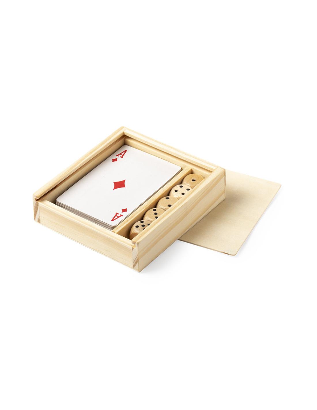 Set de juegos con baraja francesa y dados de madera, presentado en estuche individual de madera con tapa deslizante.