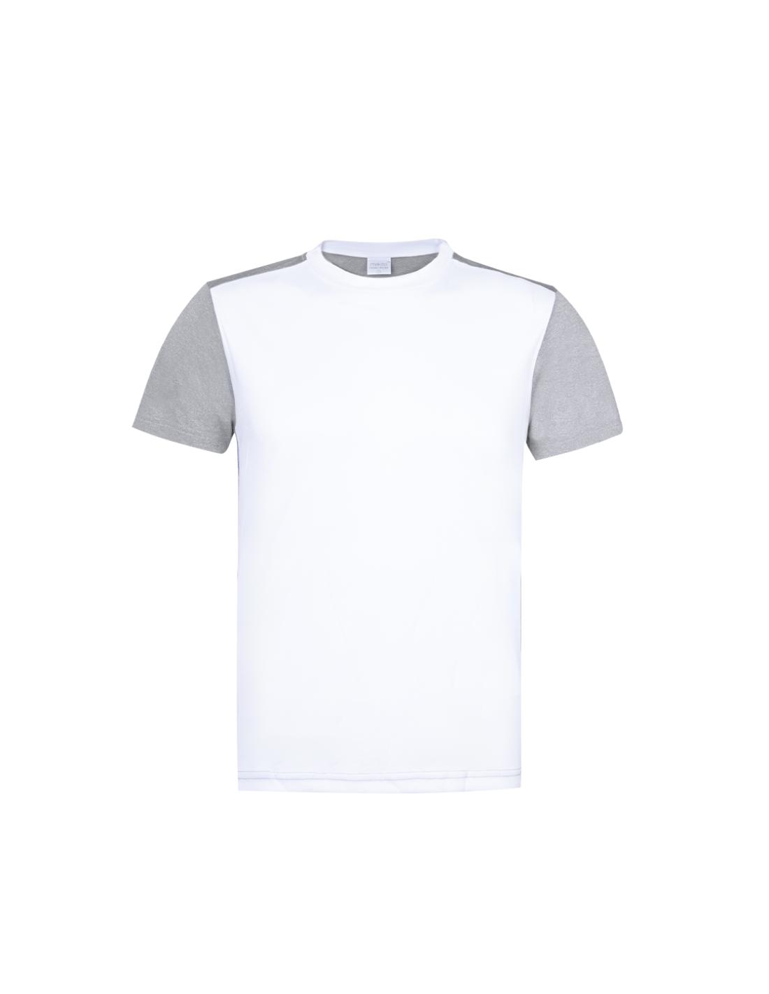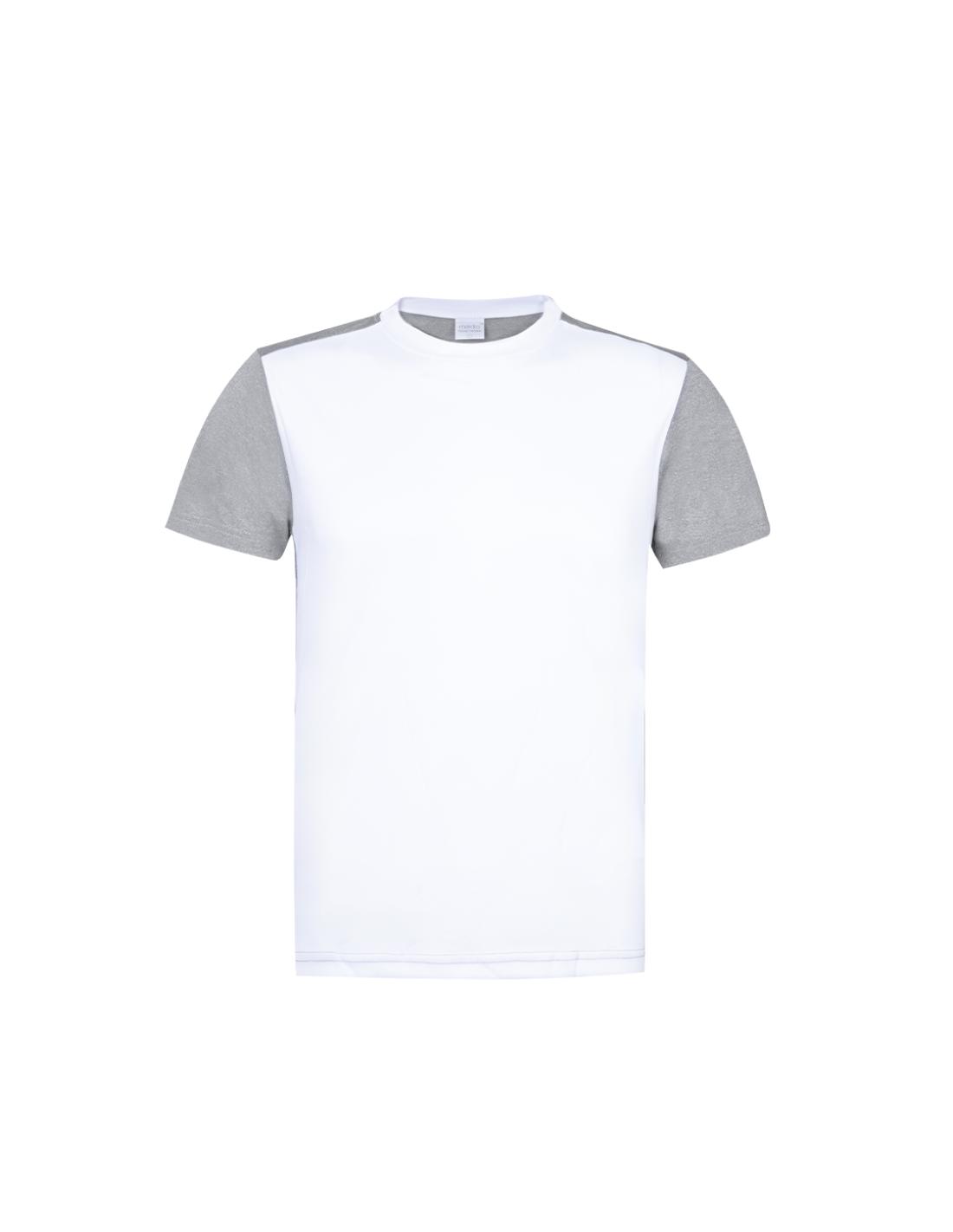 Camiseta técnica para adulto en material transpirable poliéster/elastano de 135g/m2. De elegante diseño bicolor, con frontal en color blanco, espalda detalles en gris. Disponible en tallas S, M, L, XL, XXL. Color blanco especialmente fabricado para marcaje en sublimación.