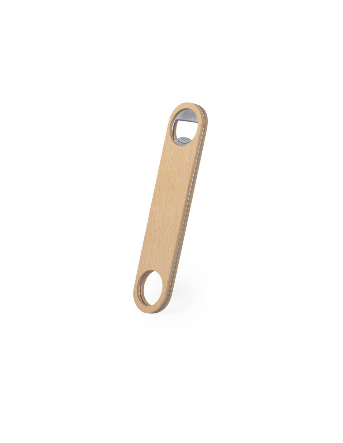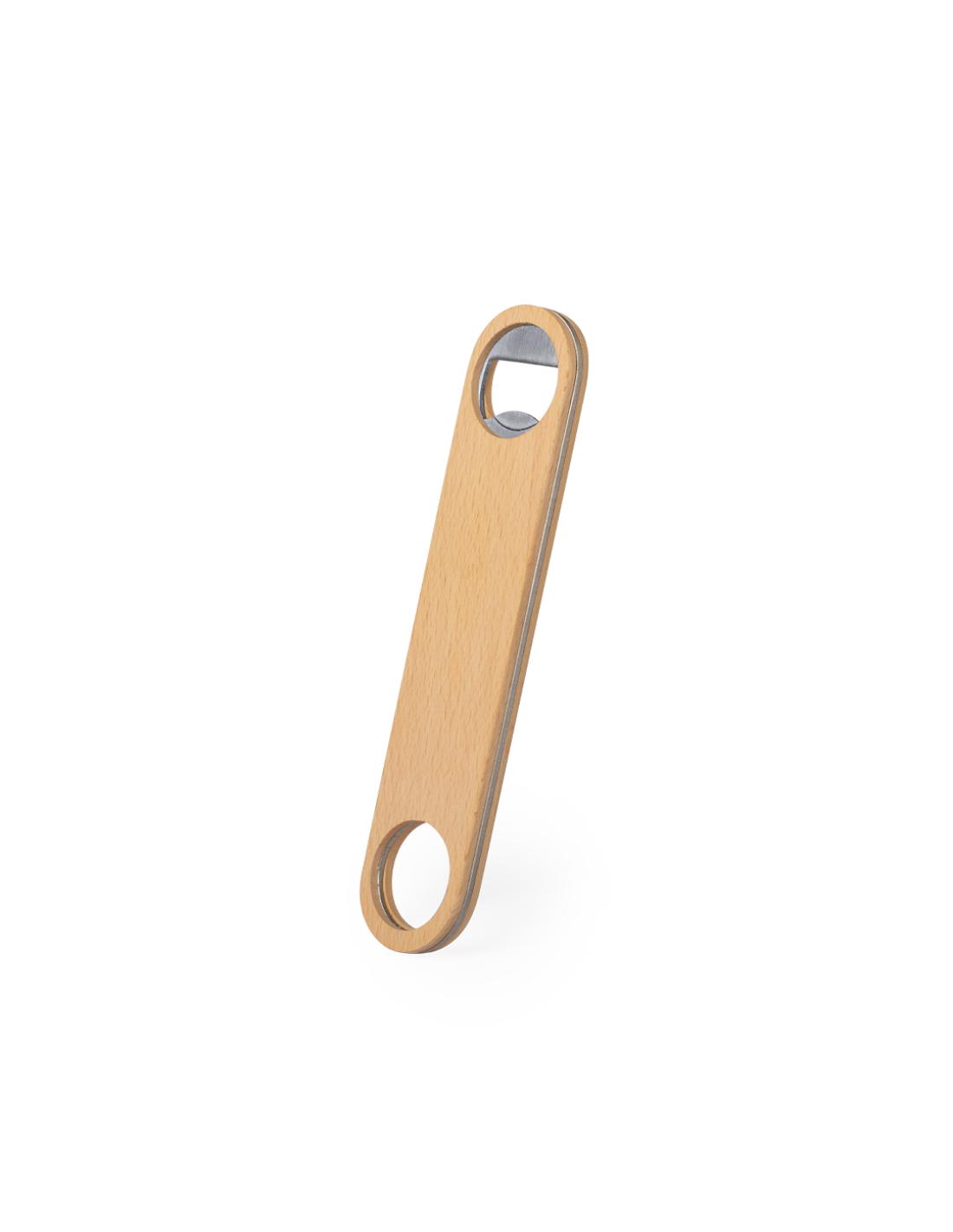 Abridor de madera de haya pulida con interior en acero inox, con troquelado para colgar.