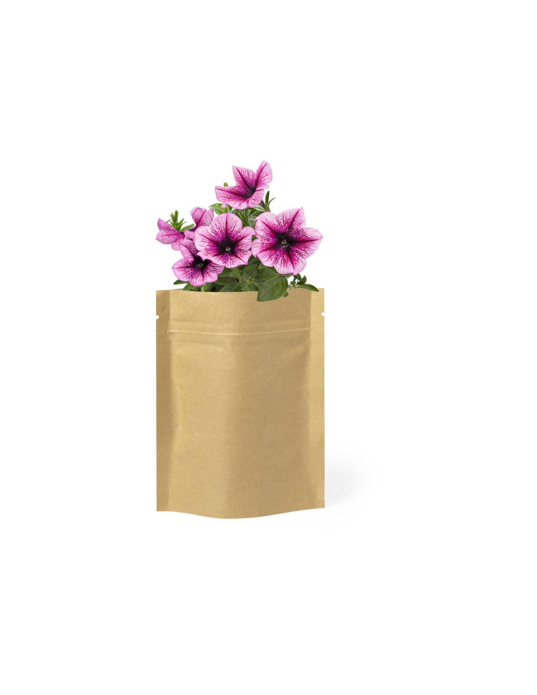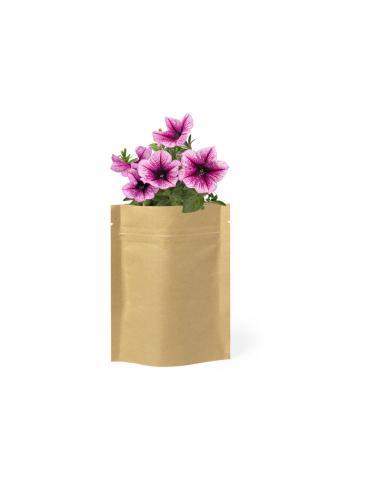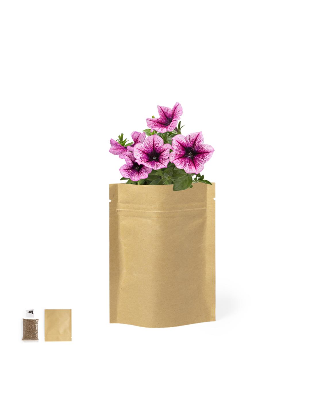 Maceta de línea nature en sobre de papel. Con 5-8 semillas de petunia y bolsita con sustrato de crecimiento.