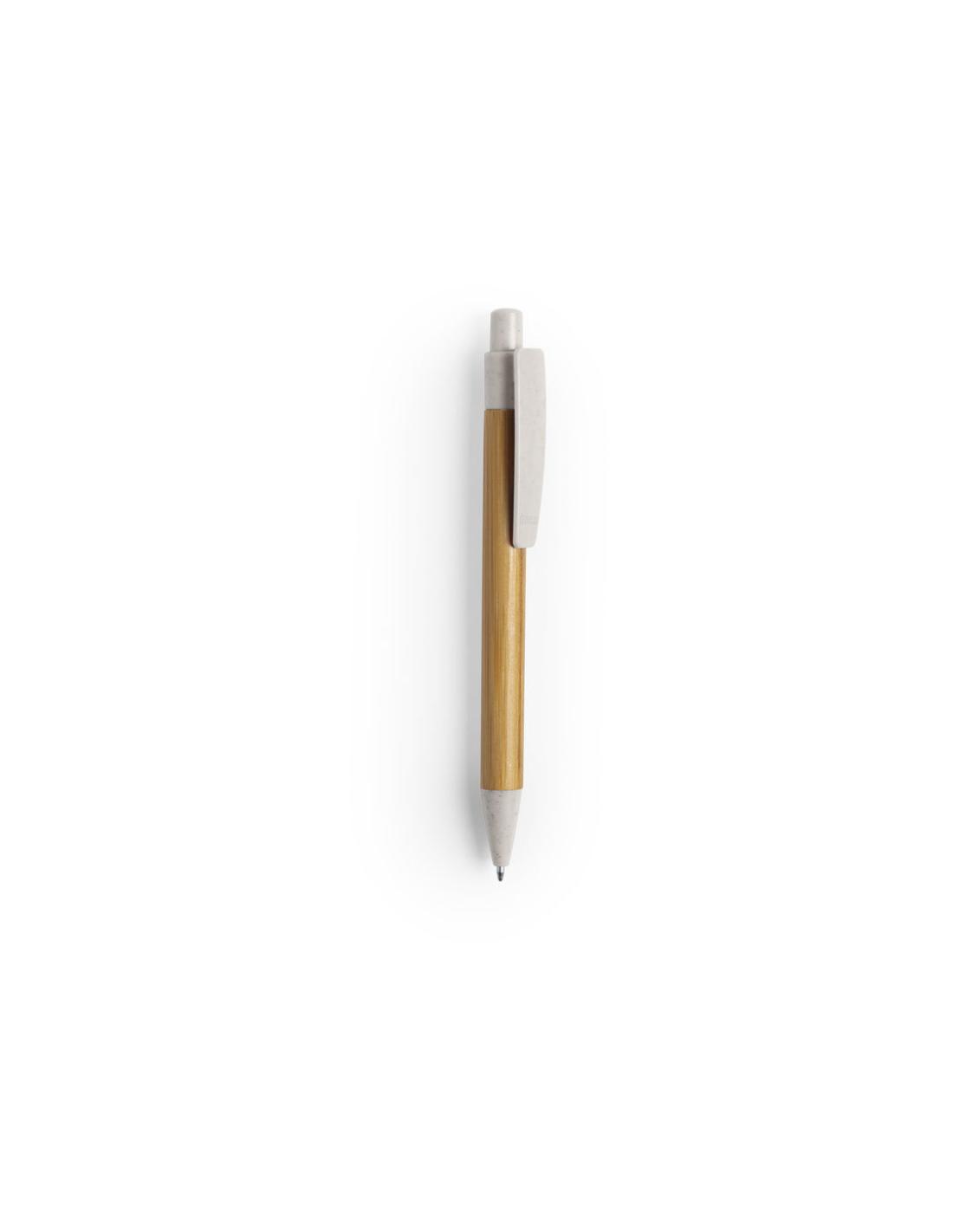 Bolígrafo con mecanismo pulsador de línea nature. Cuerpo en bambú, con accesorios a juego en caña de trigo, para así fomentar la utilización de materias primas naturales y reducir las emisiones contaminantes. Original clip tamaño XL y disponible en variada gama de colores y en tinta azul.