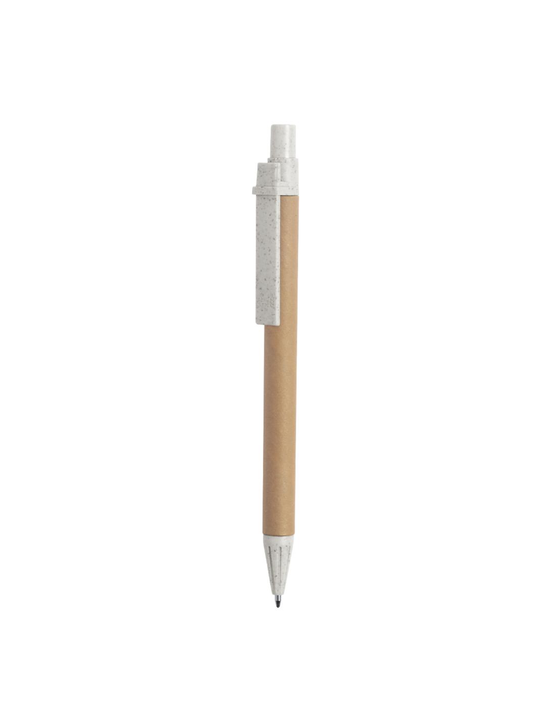 Bolígrafo con mecanismo pulsador de línea nature. Cuerpo en cartón reciclado, con accesorios en caña de trigo, para así fomentar la utilización de materias primas naturales y reducir las emisiones contaminantes. Disponible en variada gama de colores y en tinta azul.