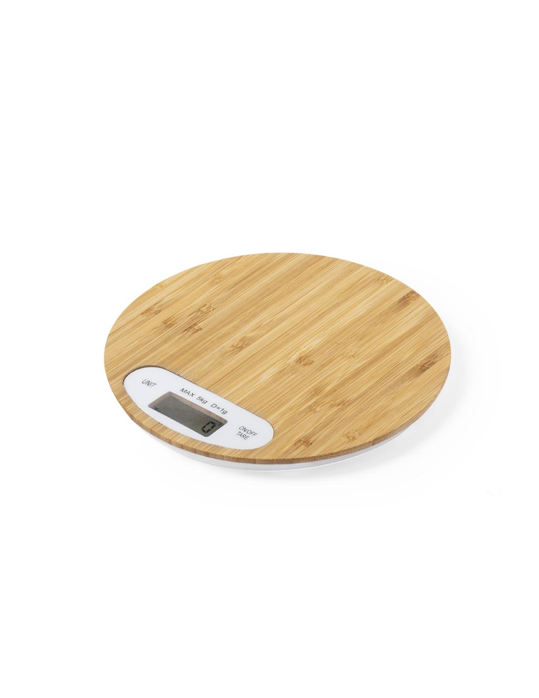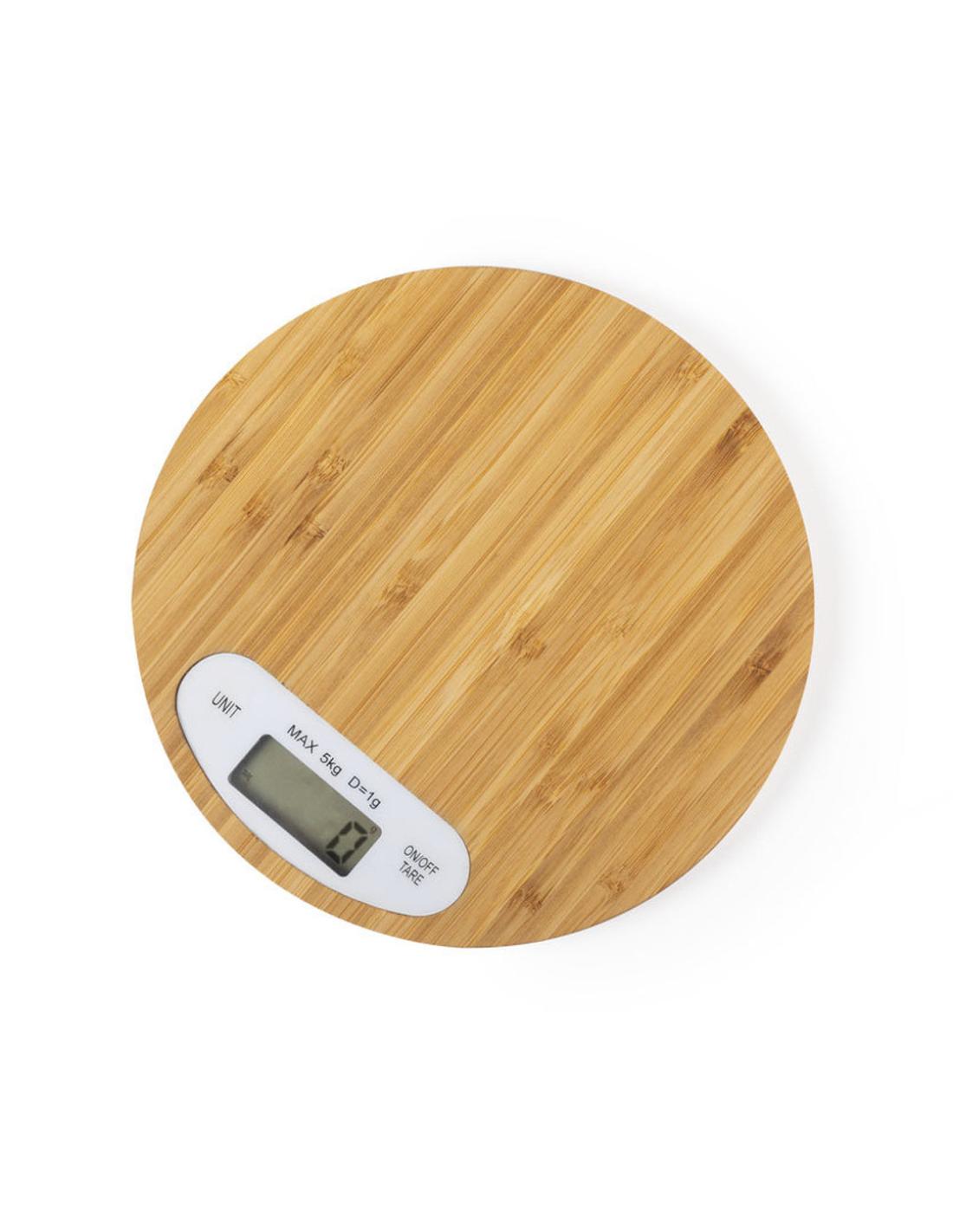 Báscula de cocina de línea nature en bambú pulido. Display digital, con funciones de apagado automático, tara y selección de unidad de pesaje. Alimentación a pilas (de botón incluidas) y peso máximo 5kg. Presentada en atractiva caja de diseño eco.