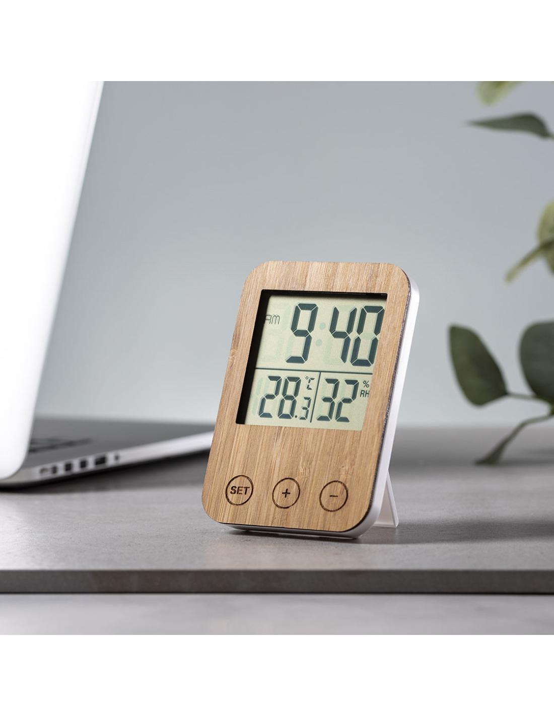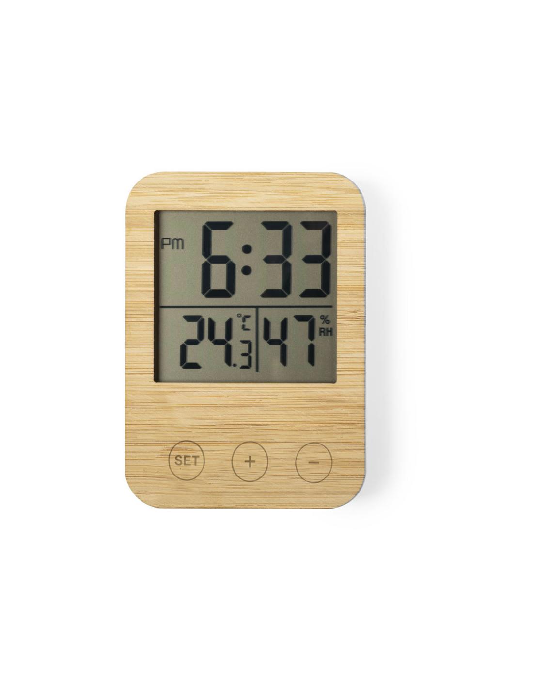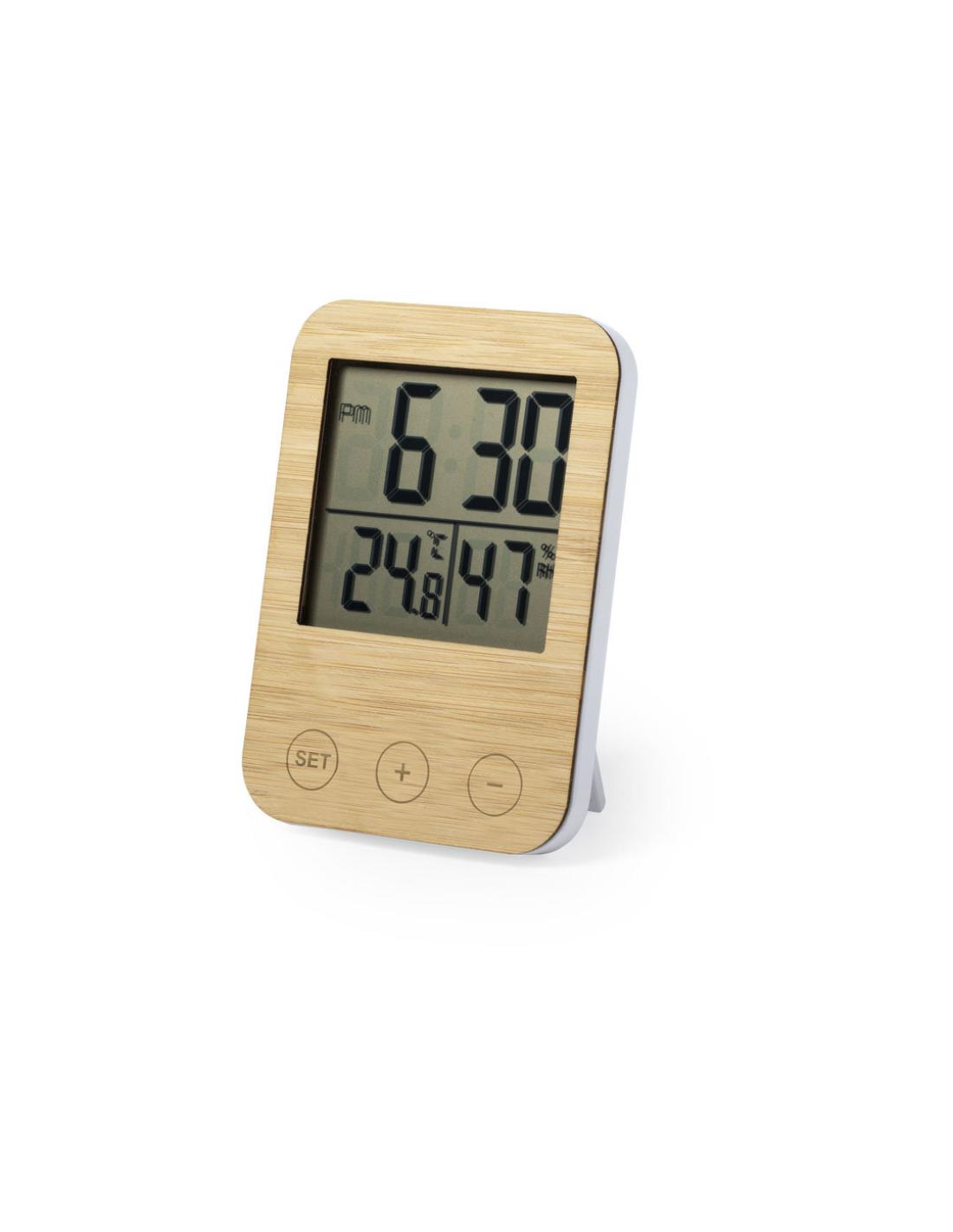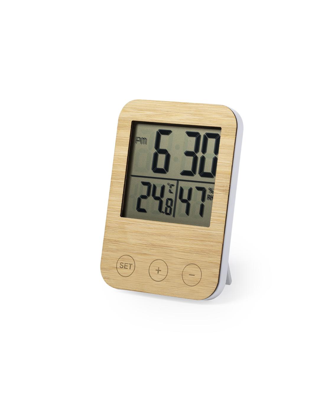 Estación meteorológica de línea nature con frontal en bambú. Funciones higrómetro y termómetro. Alimentación a pilas (2xAAA no incluidas) y presentado en atractiva caja de diseño eco.