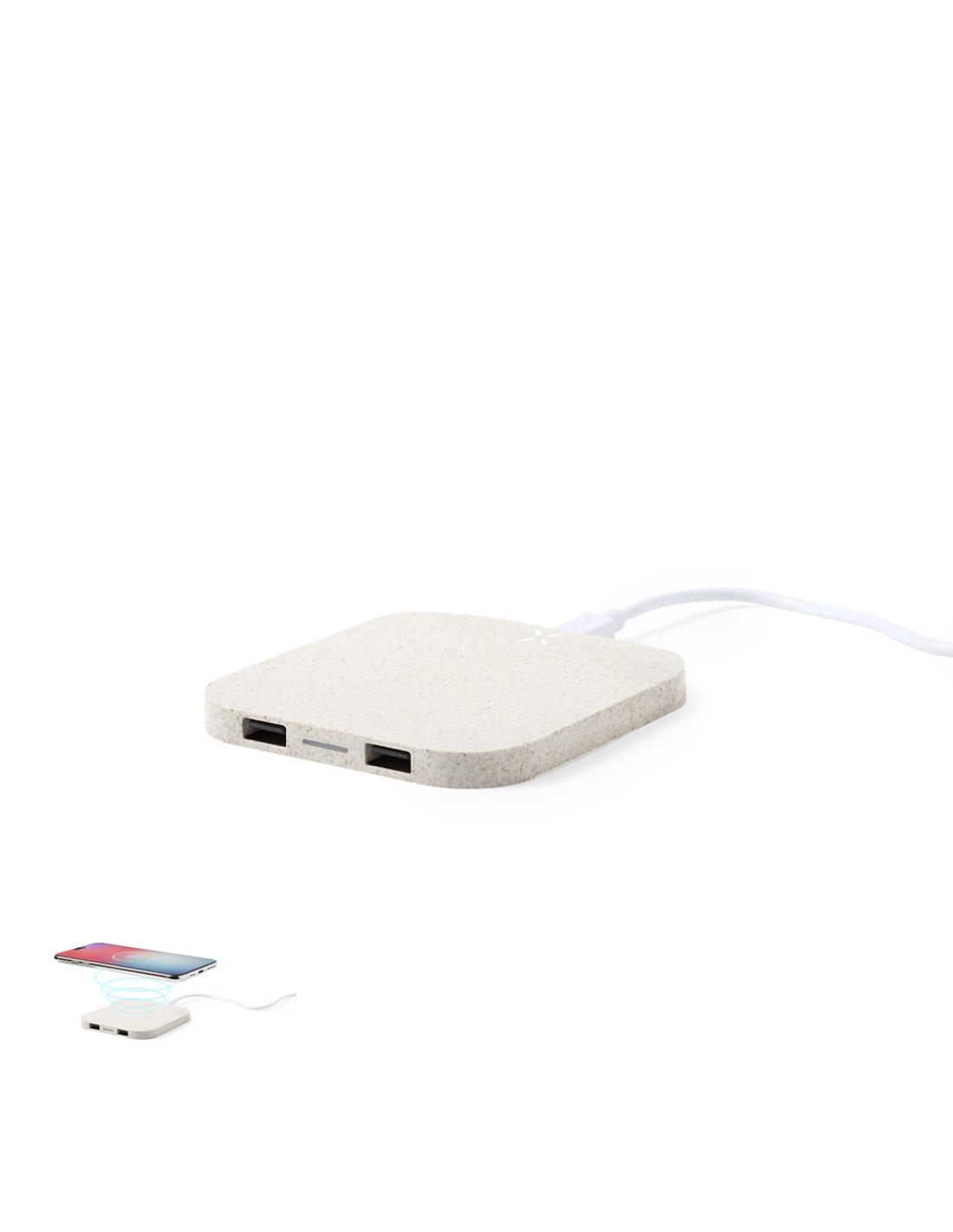 Cargador inalámbrico de línea nature. Carcasa en caña de trigo, para así fomentar la utilización de materias primas naturales y reducir las emisiones contaminantes. Con salida USB dual de 2.100 mA de capacidad para carga simultánea de hasta 3 dispositivos (1 por carga inalámbrica y 2 por cable). Base antideslizante y compatible con dispositivos equipados con tecnología de carga inalámbrica. Presentado en atractiva caja de diseño eco.